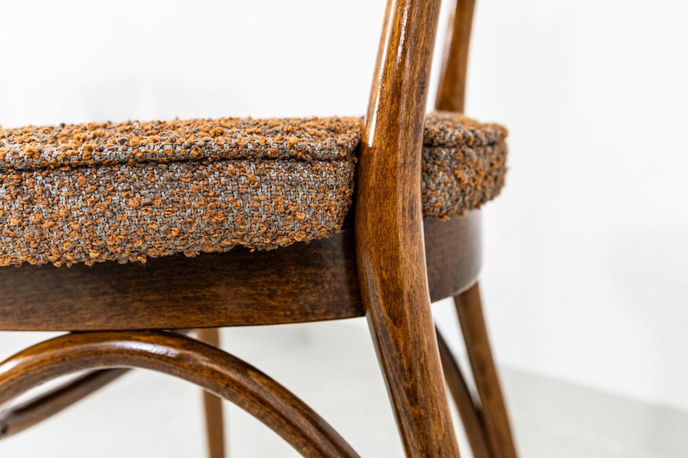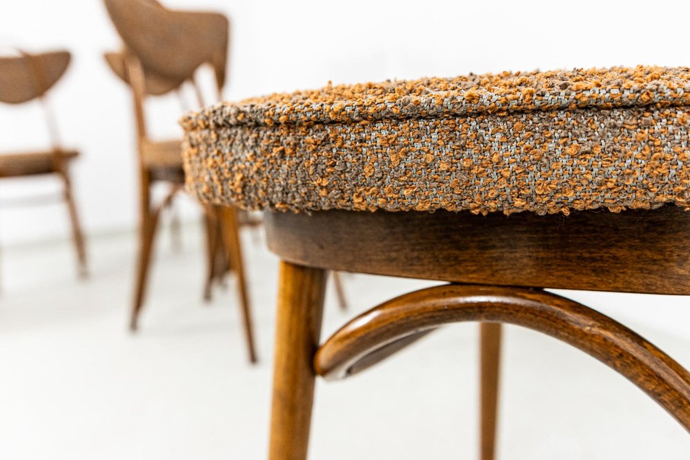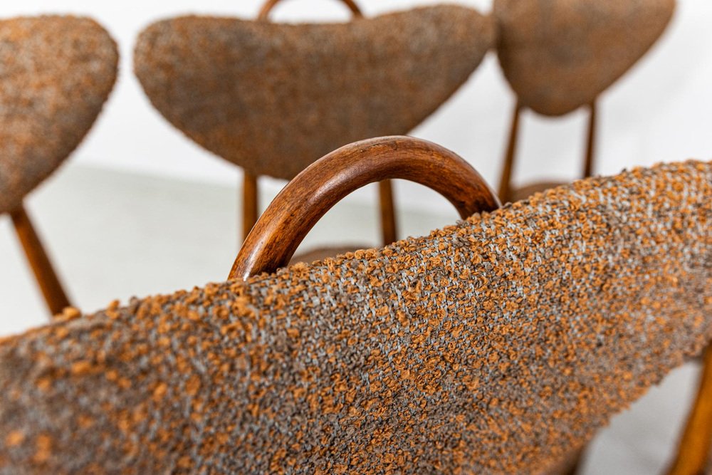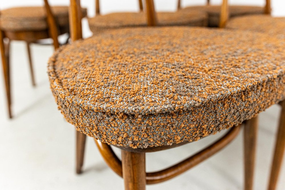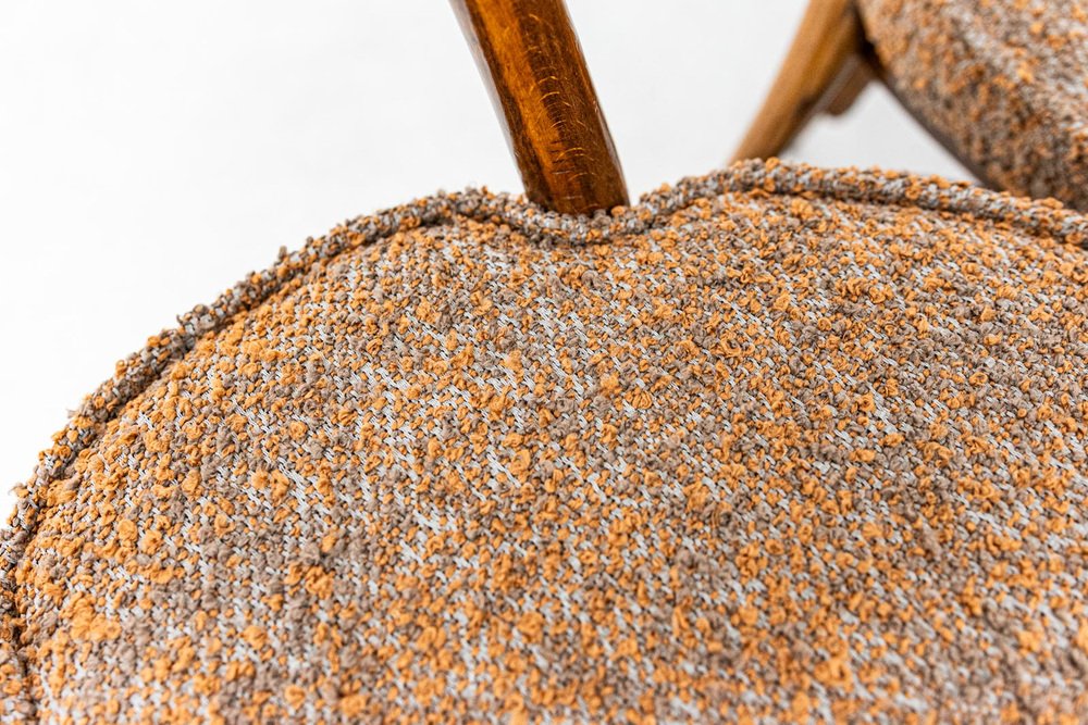 The seats and backs are upholstered with soft boucle fabric (brown, grey, orange) Although the chairs come from the same set, due to the manufacturing technique, they may slightly differ in the width of the leg spacing or the curvature of the bending.