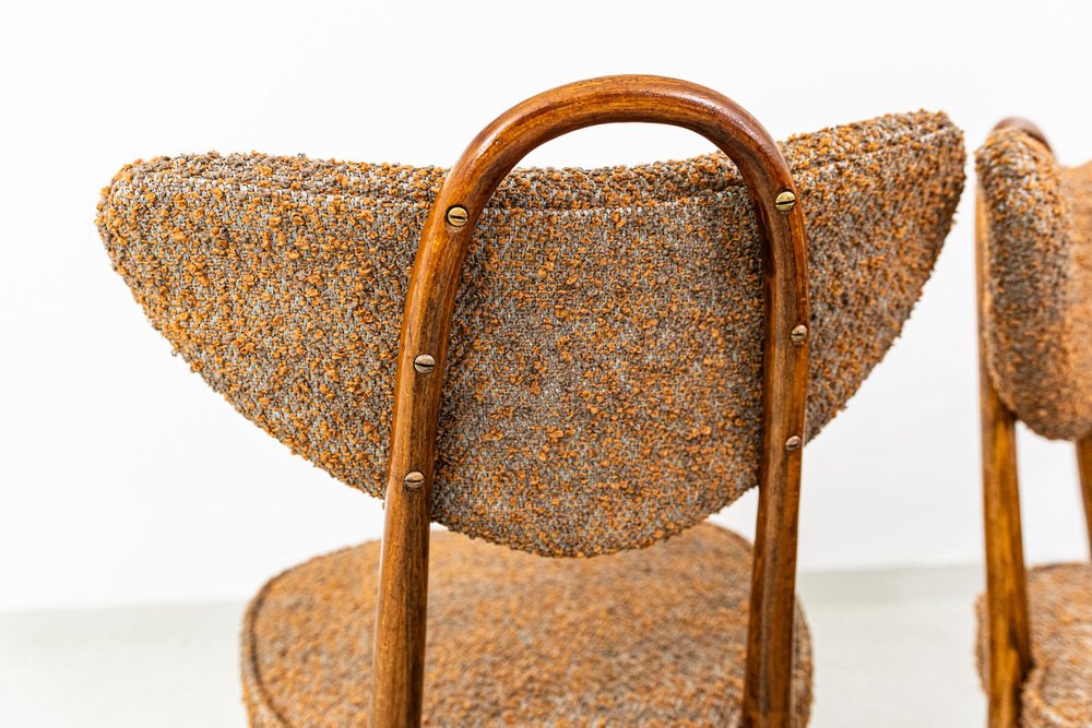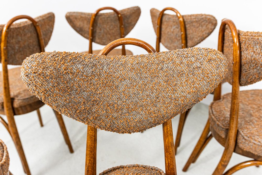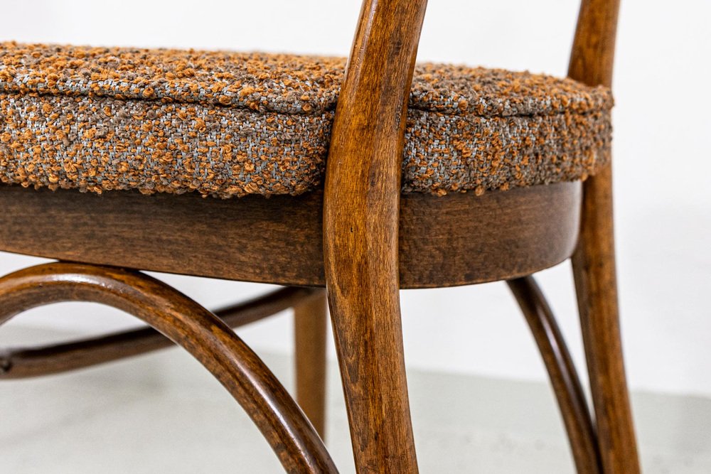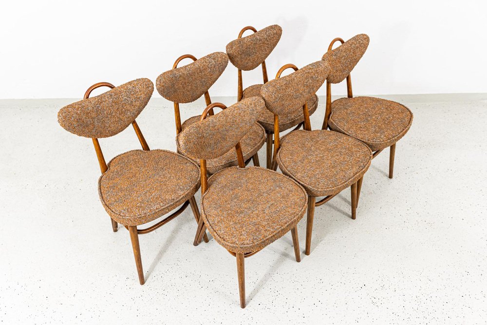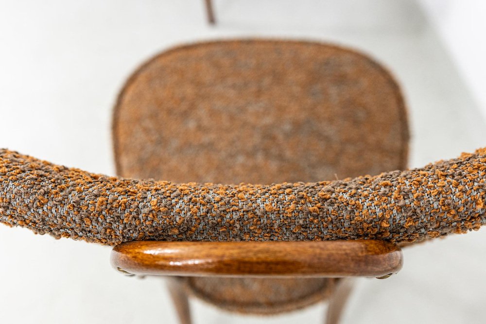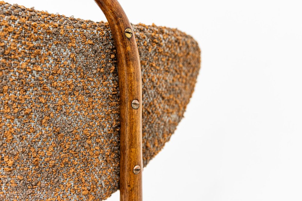 The seats and backs are upholstered with soft boucle fabric (brown, grey, orange) Although the chairs come from the same set, due to the manufacturing technique, they may slightly differ in the width of the leg spacing or the curvature of the bending.