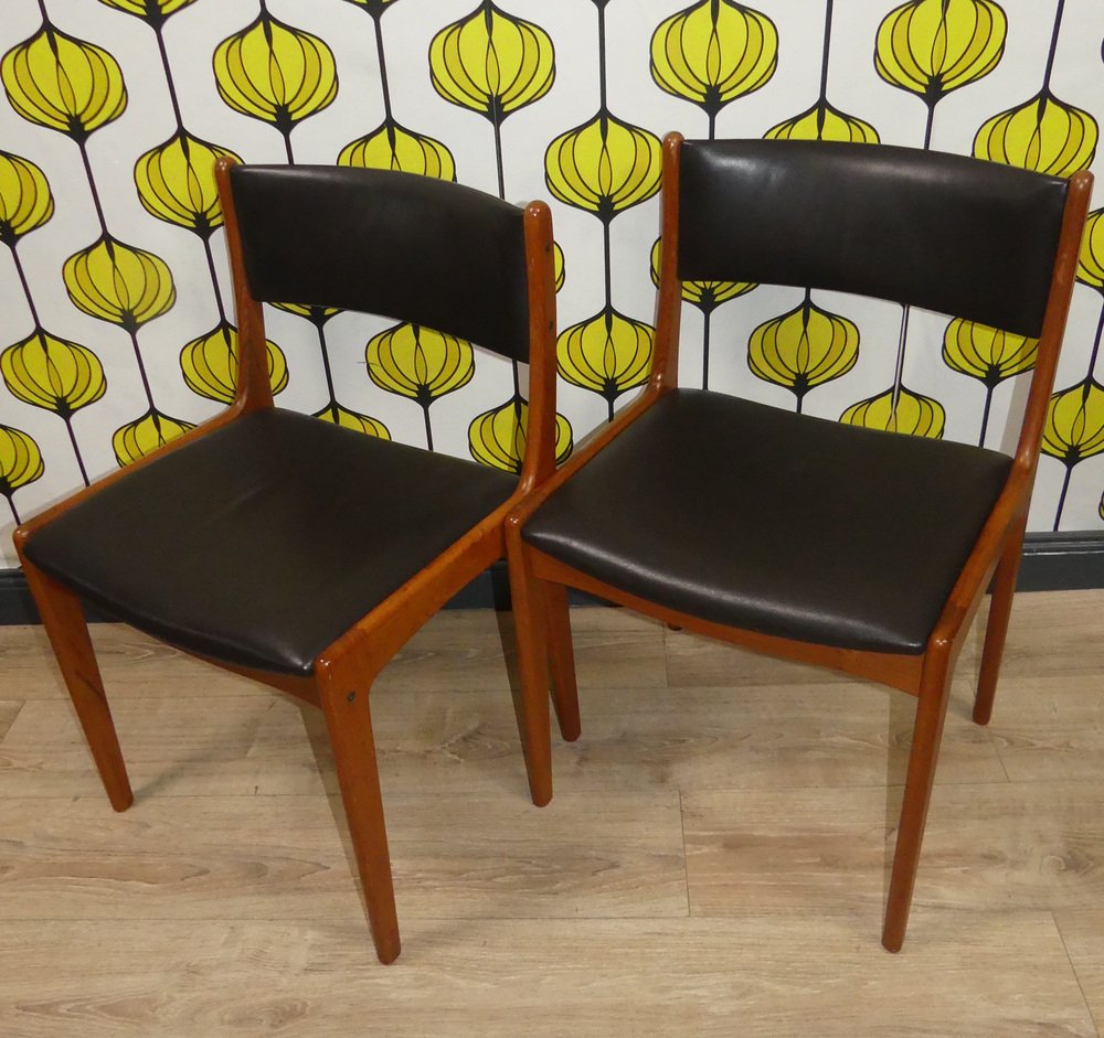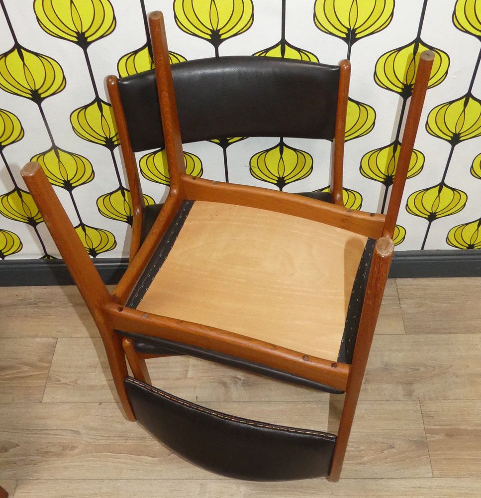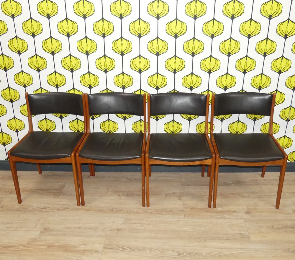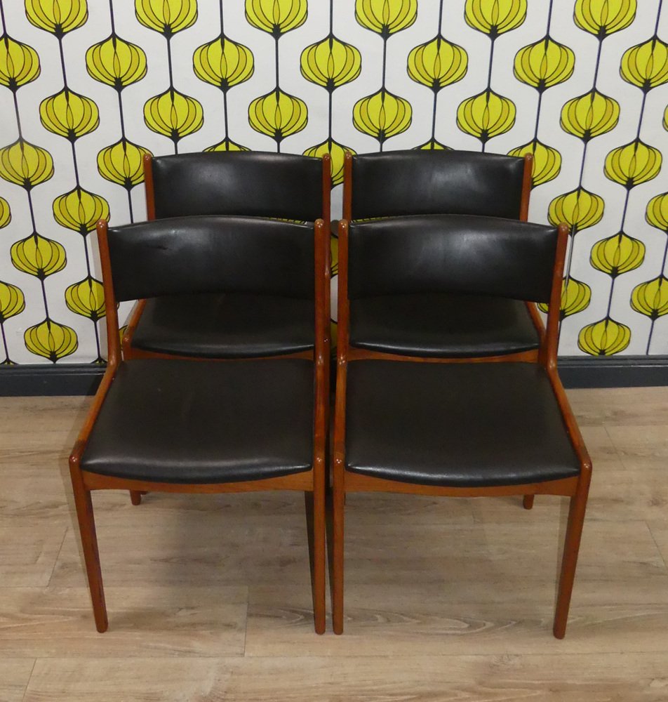 Sillas vintage de teca de cuero negro. Juego de 4