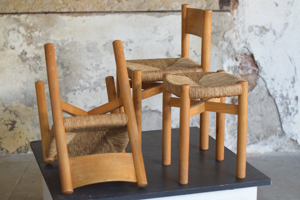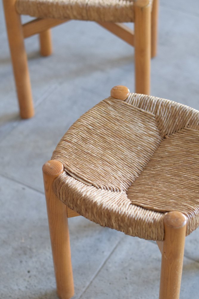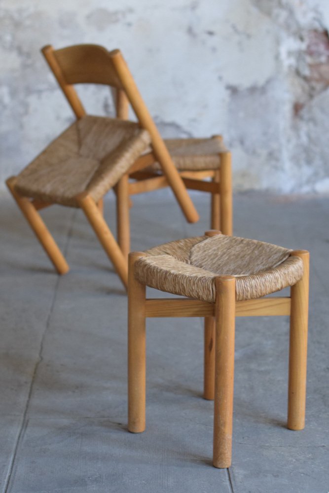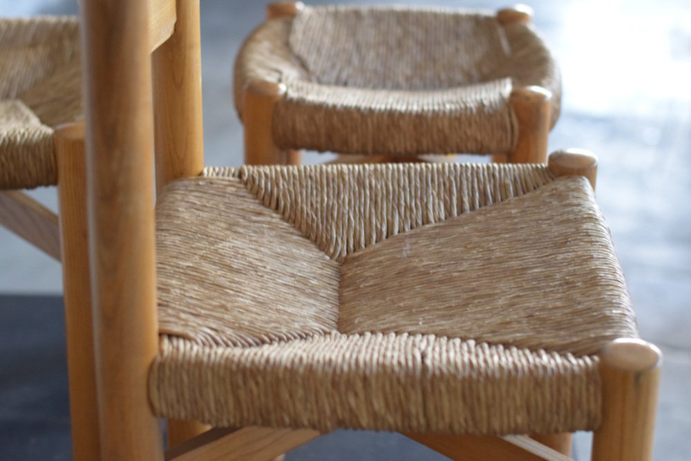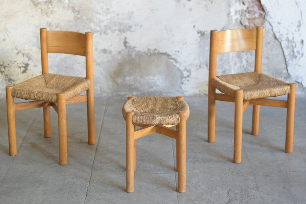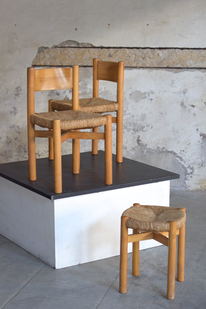 Sillas y taburete Meribel de Charlotte Perriand, años 60. Juego de 3