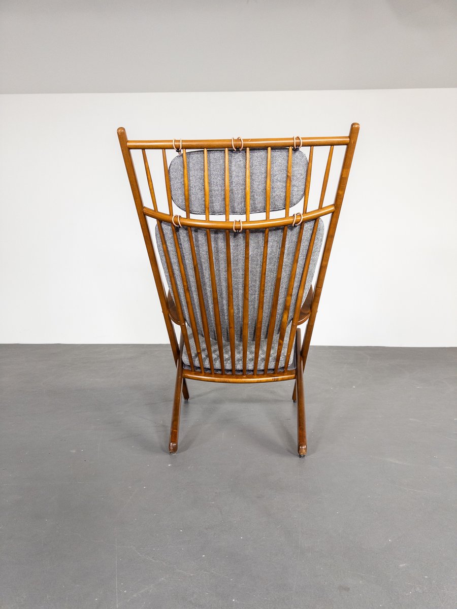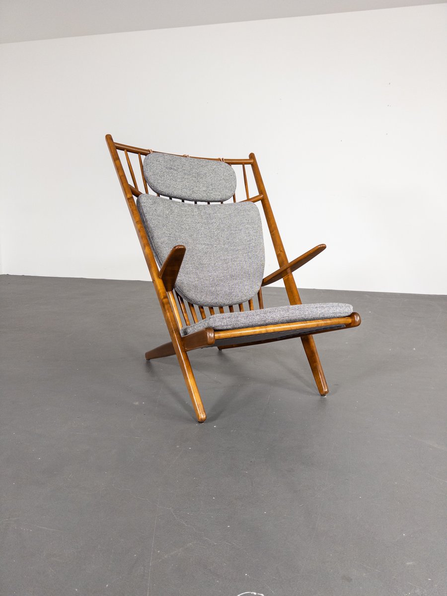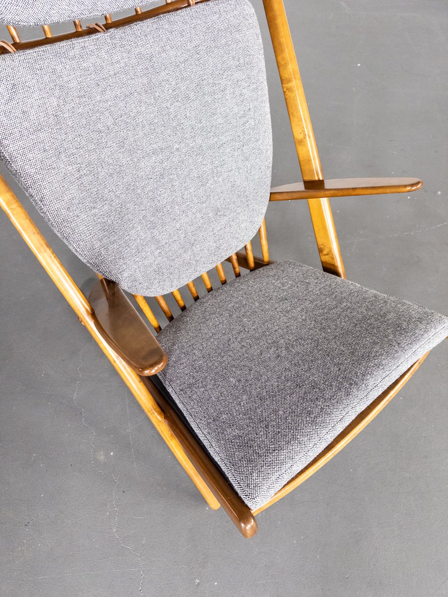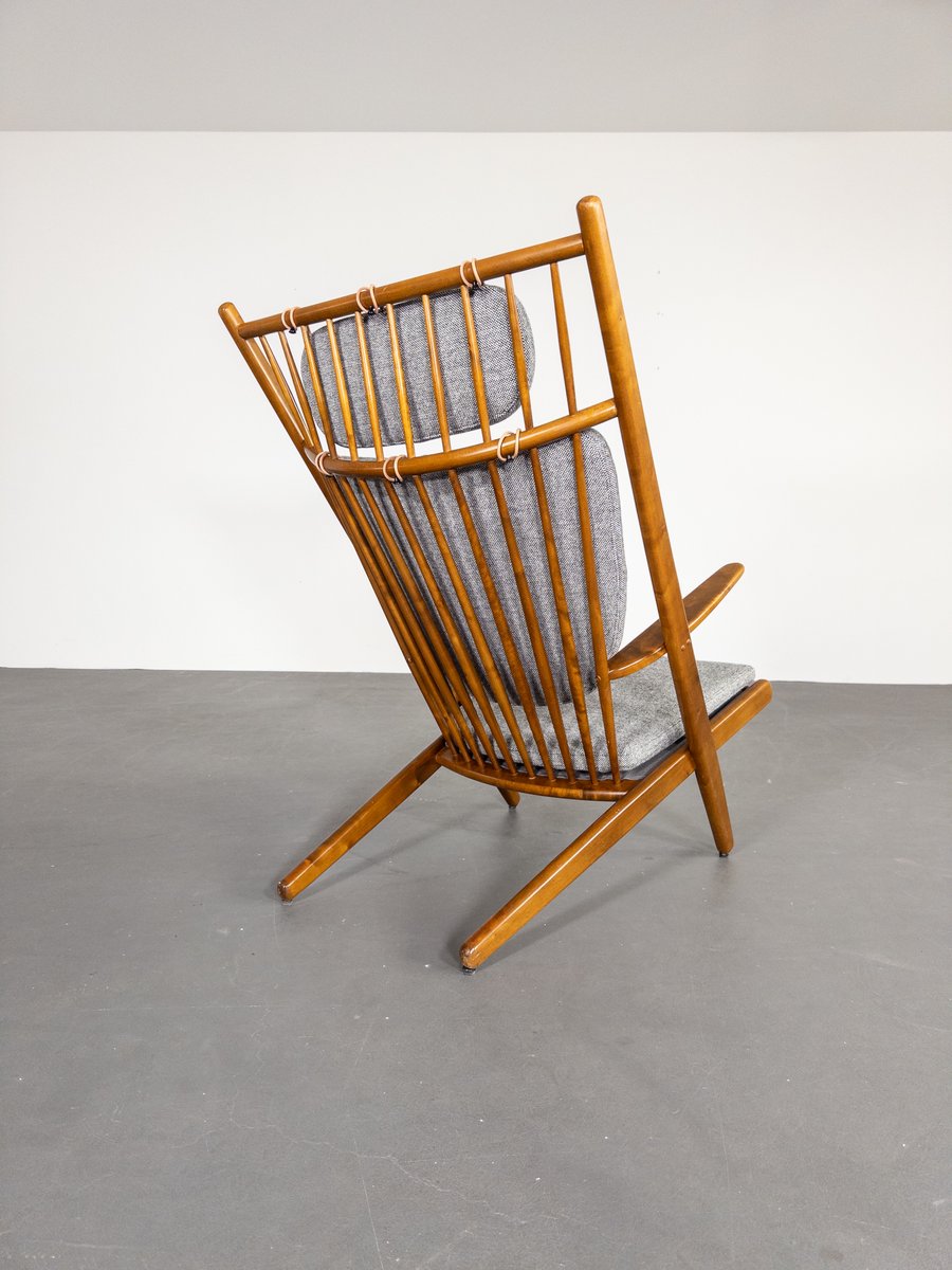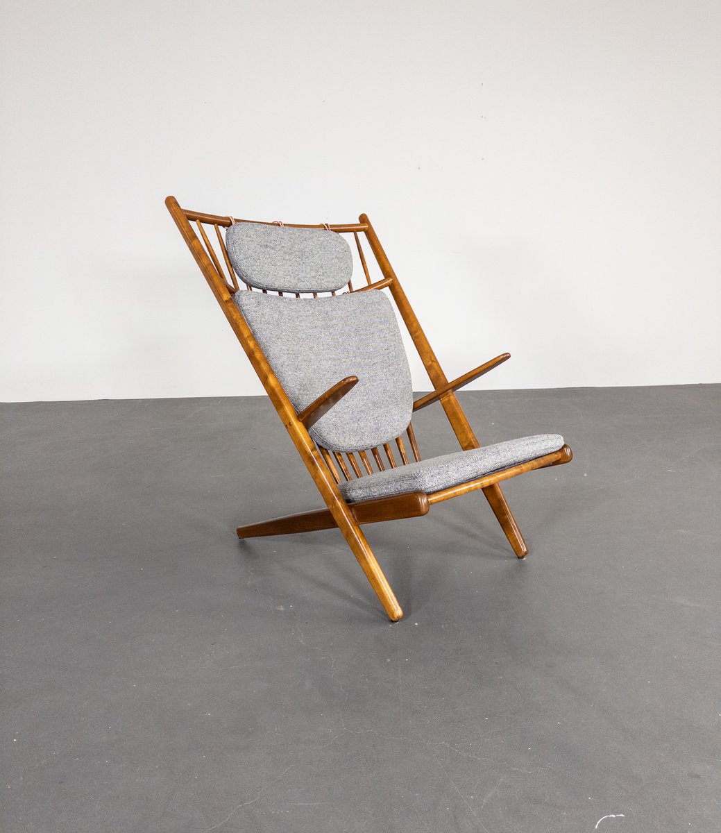 This rare “Goliat” armchair, designed by Paul M. Volther for Gemla in the 1960s, showcases the clean lines and functional elegance typical of Scandinavian modern design. The wooden frame features a spindle back and has been finished to a warm luster, emphasizing the natural beauty of the material. Newly sewn cushions, crafted by a professional upholsterer, add contemporary comfort while preserving the chair’s timeless mid-century character. The “Goliat” stands as an iconic example of Swedish furniture design, blending aesthetic appeal with everyday practicality.