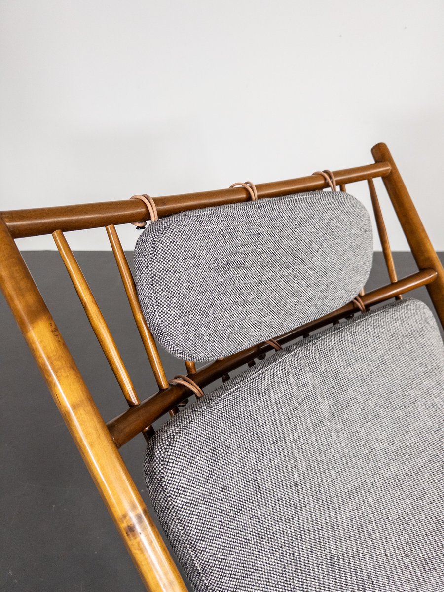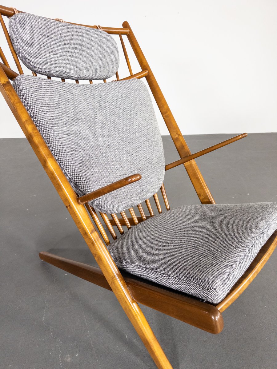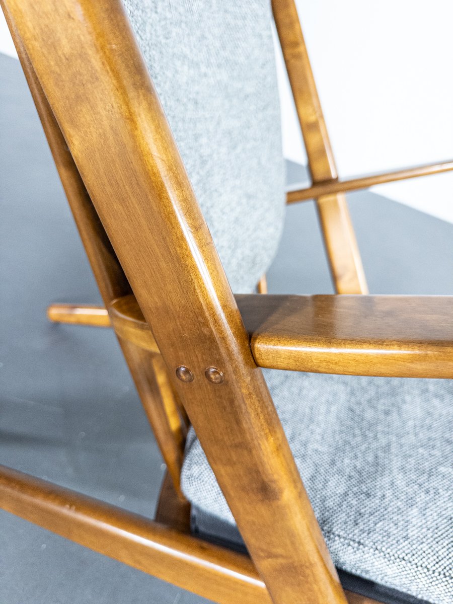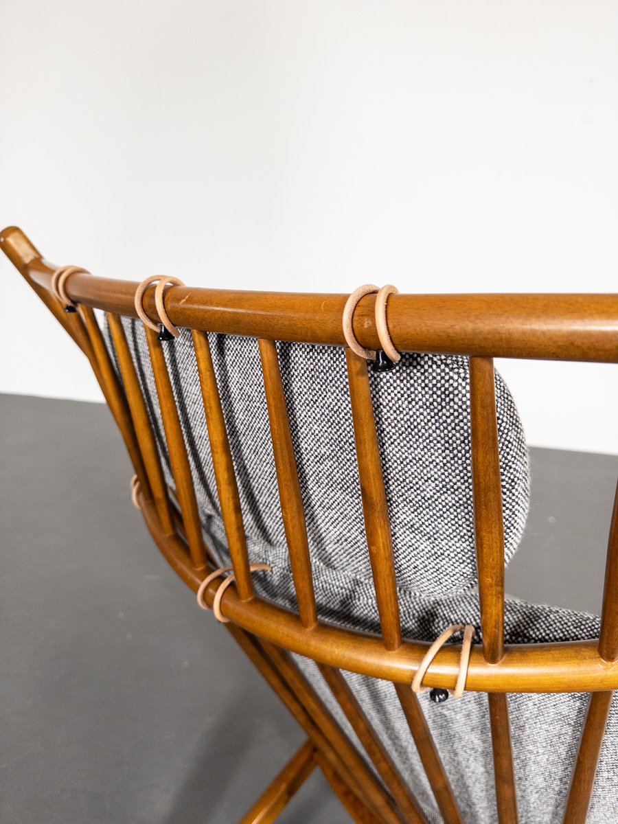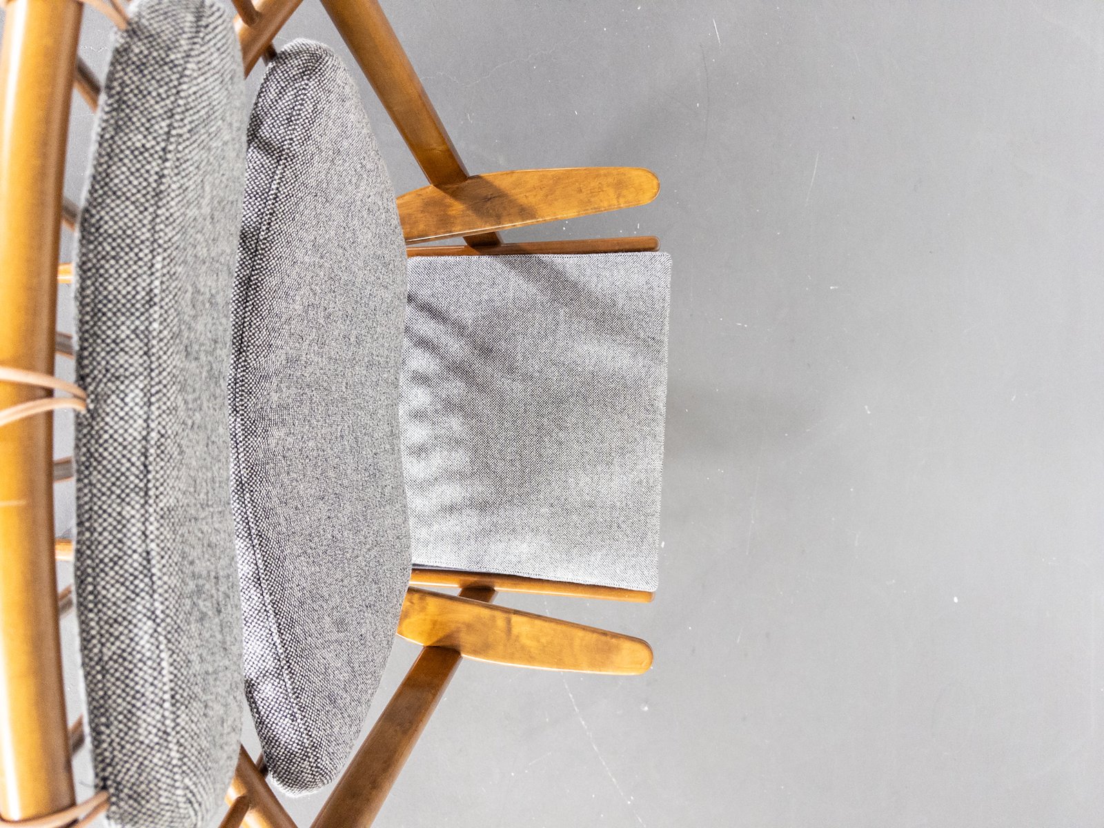 This rare “Goliat” armchair, designed by Paul M. Volther for Gemla in the 1960s, showcases the clean lines and functional elegance typical of Scandinavian modern design. The wooden frame features a spindle back and has been finished to a warm luster, emphasizing the natural beauty of the material. Newly sewn cushions, crafted by a professional upholsterer, add contemporary comfort while preserving the chair’s timeless mid-century character. The “Goliat” stands as an iconic example of Swedish furniture design, blending aesthetic appeal with everyday practicality.