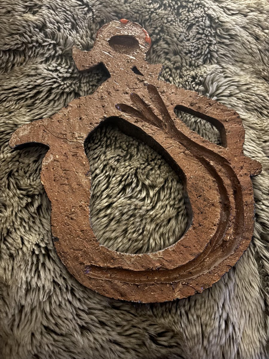 La silueta calada confiere a la pieza una fuerte presencia gráfica. El cuerpo está elaborado en arcilla chamota, intencionadamente sin esmaltar, lo que revela una auténtica textura mineral. El cabello rojo esmaltado, sutilmente craquelado, contrasta con la cola azulada en relieve. El efecto general crea un juego de texturas y colores típico de las exploraciones artísticas de los talleres belgas de este periodo. La parte posterior está empotrada para permitir un discreto montaje en la pared. Una pieza decorativa única, ideal para un interior de mediados de siglo, un entorno vintage de los años 70 o una colección de cerámica de talleres europeos. Dimensiones Altura: 31 cm Anchura: 24 cm Profundidad: 4 cm Estado Muy buen estado vintage. Sin grietas ni astillas. Ligeras irregularidades inherentes a la naturaleza artesanal de la arcilla.