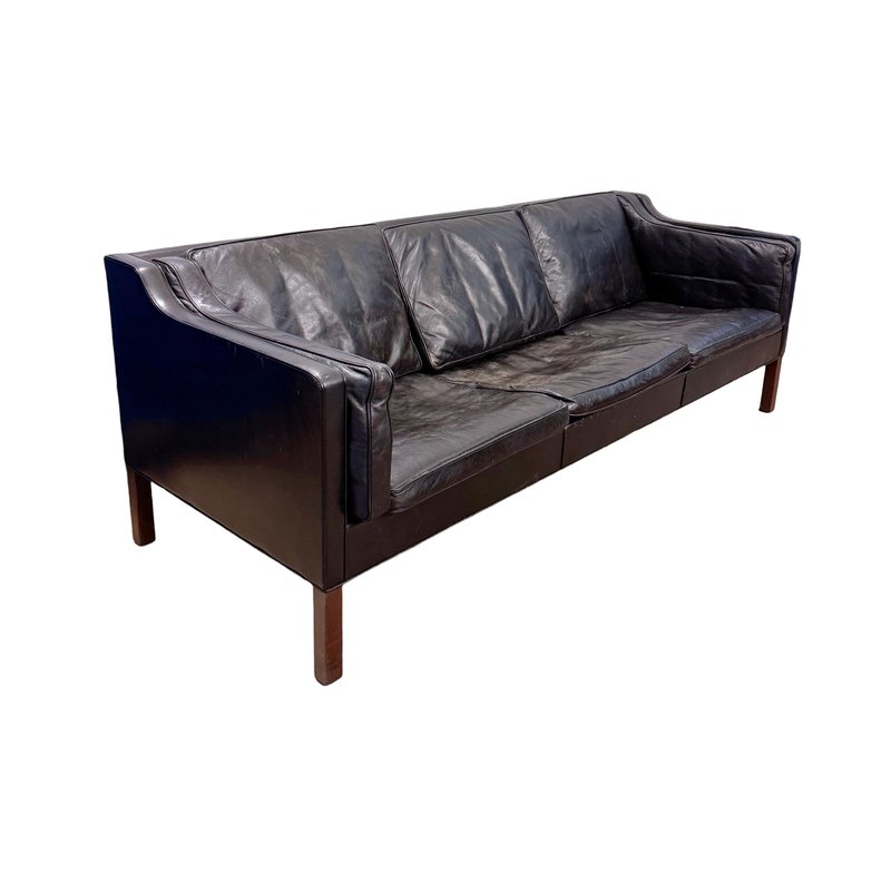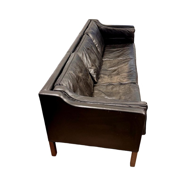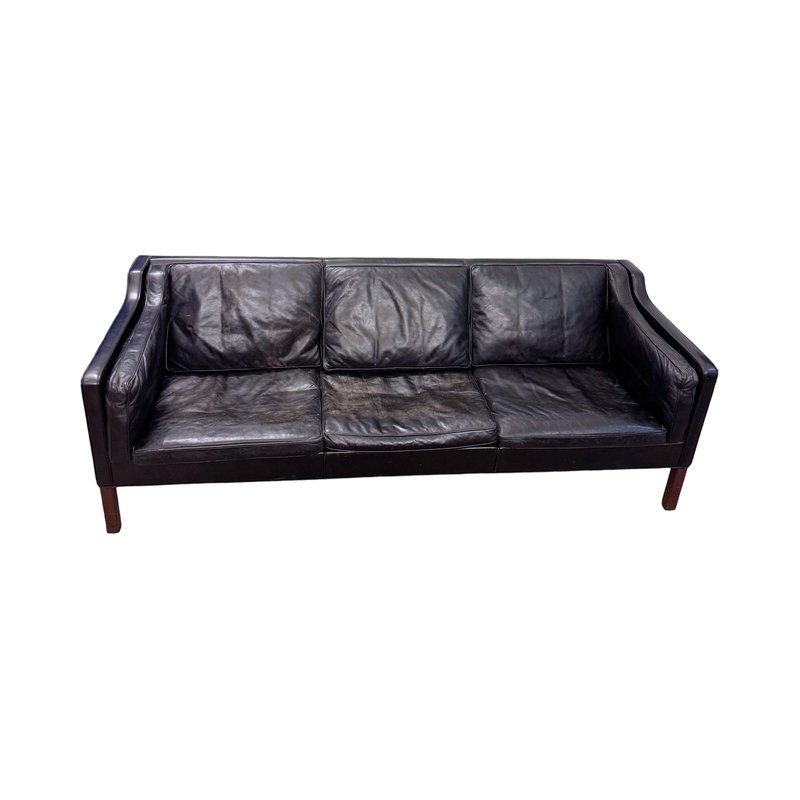 The “2213” three-seater sofa, designed by Danish designer Børge Mogensen, is a true icon of Scandinavian modernism. Manufactured by Fredericia Furniture, this model combines minimalist design, premium materials, and exceptional comfort. Original factory labels are present, confirming the authenticity of the piece. About the Designer Børge Mogensen (1914–1972) was one of the pioneers of Danish modernism, known for his simple, functional, and durable designs. • In 1962, Mogensen created the “2213” sofa for his own home, focusing on comfort and versatility. • His philosophy emphasized “furniture for life” — practical and aesthetically pleasing pieces for everyday use. About the “2213” Model • Part of the “2200” collection, the “2213” sofa was designed as a versatile piece of furniture, perfect for modern interiors. • The original black leather upholstery and teak frame highlight the model’s premium quality. • Compact yet spacious dimensions ensure comfort and make it suitable for various spaces. • Designer: Børge Mogensen • Manufacturer: Fredericia • Model: 2213 • Materials: • Upholstery: Genuine black leather. • Frame: Teak. • Dimensions: • Width: 221 cm (87 in) • Depth: 81 cm (31.9 in) • Height: 80 cm (31.5 in) • Seat height: 43 cm (16.9 in) • Features: Original Fredericia labels confirm the model’s authenticity. Condition The sofa is in very good vintage condition. Light patina on the leather emphasizes its age, while the materials and structure remain durable and visually appealing. Highlights • Iconic design, timeless and functional. • Premium materials, including genuine leather and teak. • Excellent condition for its age. • A versatile piece that fits both modern and classic interiors.