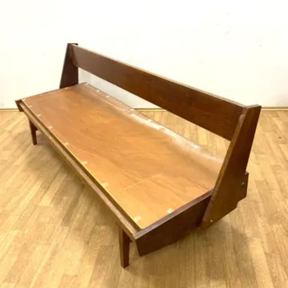 The sofa retains its original removable mattress, and the wooden frame is strong and healthy. The upholstery shows signs of age and is best suited for future renovation, while minor lacquer wear on the frame reflects its vintage authenticity.