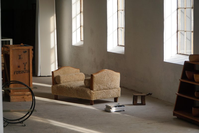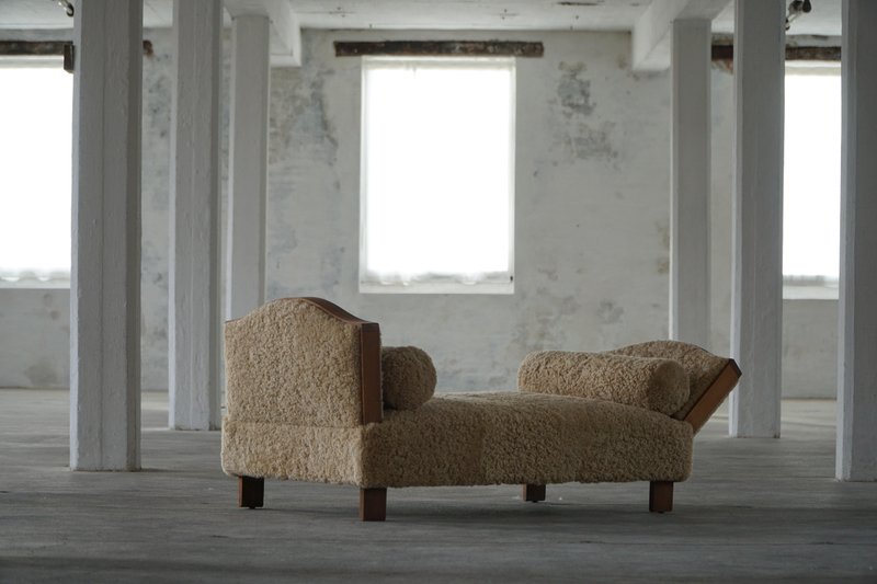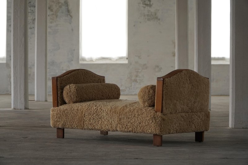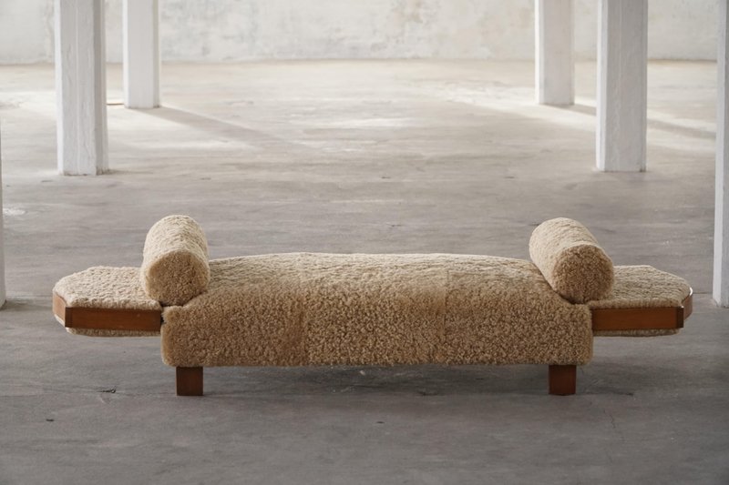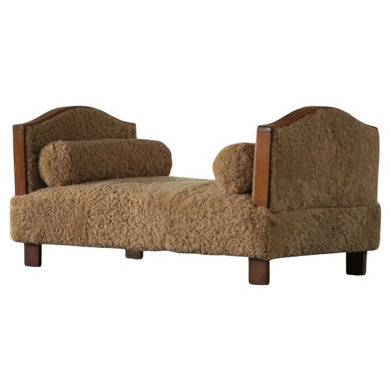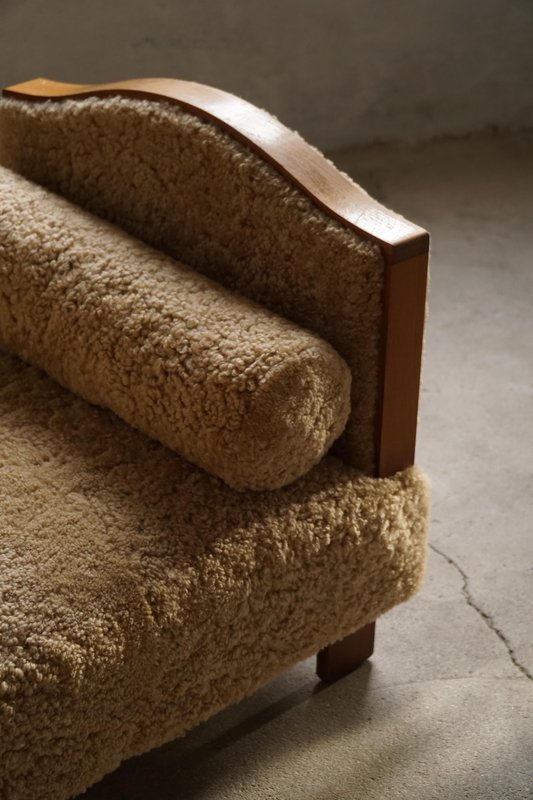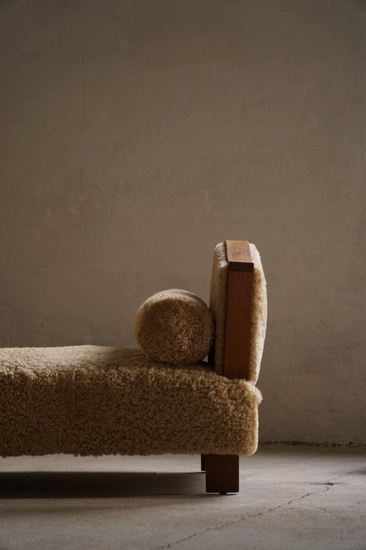 A beautifully minimalist Art Deco daybed combining clean lines with tactile richness. The freestanding frame is crafted from beech with rounded wooden panels on the sides/armrests, creating a soft, sculptural silhouette. The daybed has been newly upholstered in luxurious natural lambswool, covering both the seat and sides, providing a soft and inviting texture. It includes two round lambswool cushions that cleverly conceal the mechanisms for the adjustable sides/armrests, allowing the length of the daybed to be modified for comfort and versatility - extends to length of 198 cm. An elegant piece that complements a wide range of interiors, from modern and Scandinavian to classic or Art Deco-inspired spaces. Its minimalist sculptural form and luxurious materials make it both functional and decorative.