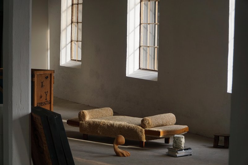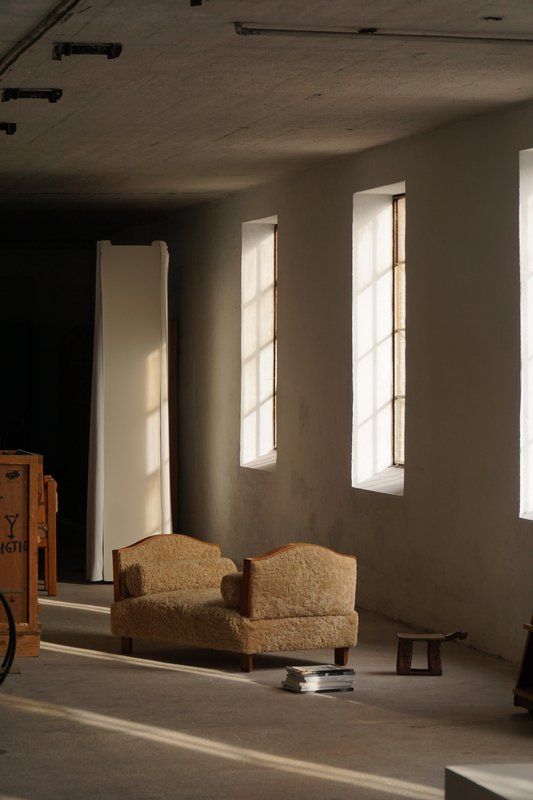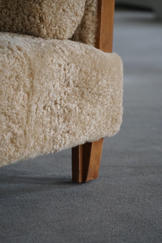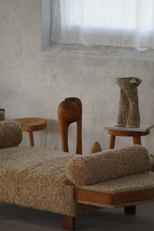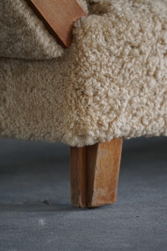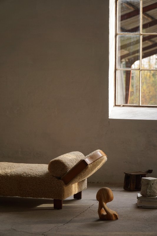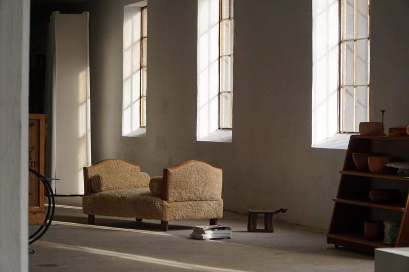 A beautifully minimalist Art Deco daybed combining clean lines with tactile richness. The freestanding frame is crafted from beech with rounded wooden panels on the sides/armrests, creating a soft, sculptural silhouette. The daybed has been newly upholstered in luxurious natural lambswool, covering both the seat and sides, providing a soft and inviting texture. It includes two round lambswool cushions that cleverly conceal the mechanisms for the adjustable sides/armrests, allowing the length of the daybed to be modified for comfort and versatility - extends to length of 198 cm. An elegant piece that complements a wide range of interiors, from modern and Scandinavian to classic or Art Deco-inspired spaces. Its minimalist sculptural form and luxurious materials make it both functional and decorative.