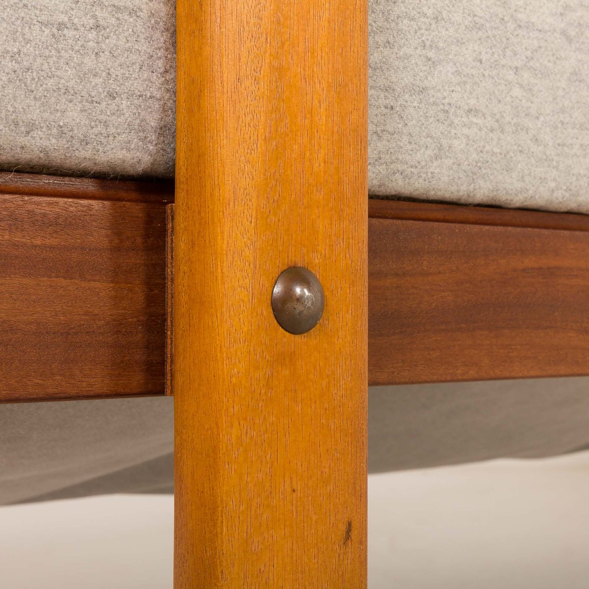 Pillows and mattresses have been reupholstered in elegant, light gray, fully natural wool fabric, and foams have been exchanged. Excellent condition. Total length reaches 190 cm.