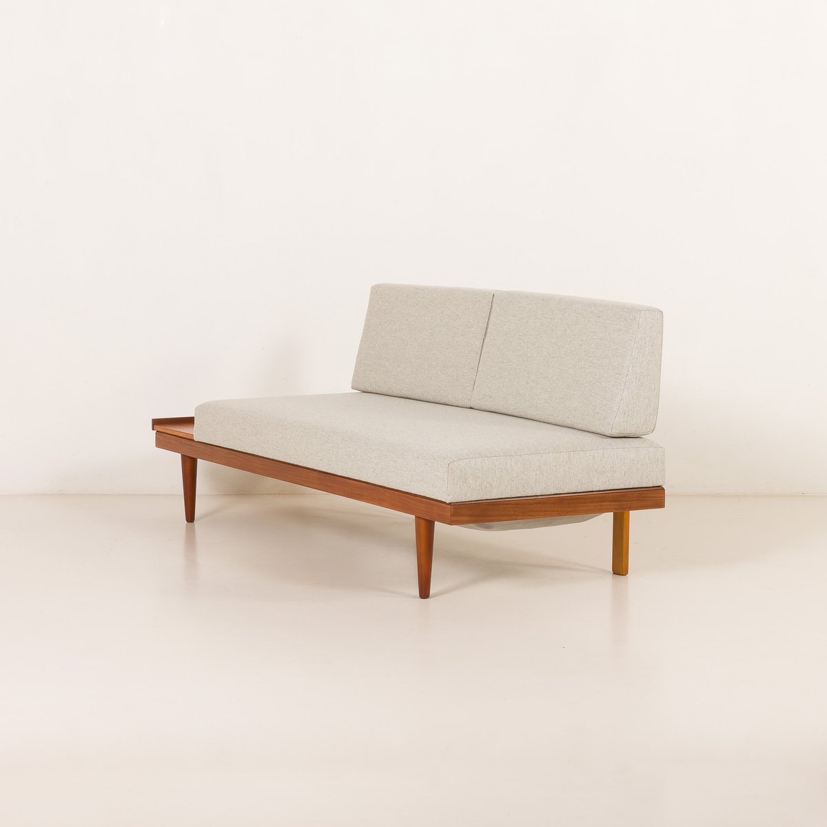 Excelente estado general con pequeños signos de uso. La madera se ha limpiado y protegido con capas de aceite danés. Dimensiones adicionales: Dimensiones de la mesa auxiliar: Altura: 22 cm / Anchura: 33 cm / Profundidad: 71 cm Altura del asiento: 42 cm Distancia al suelo: 22 cm Cojín del respaldo: Altura: 36 cm / Anchura: 75 cm / Profundidad: 15 cm