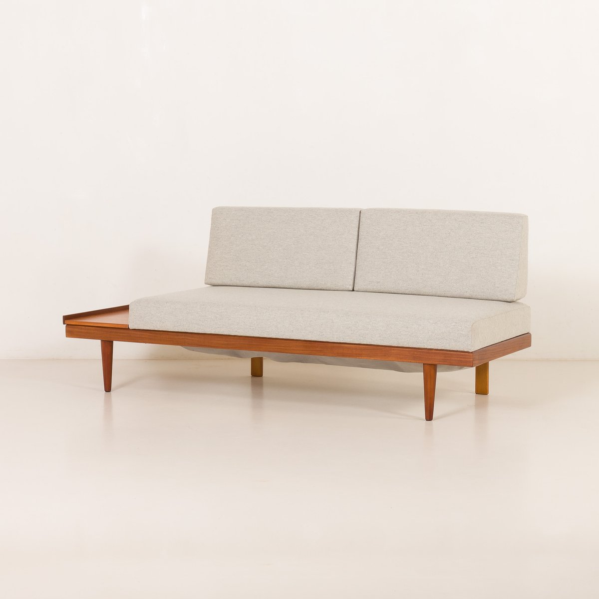 Este sofá vintage tiene una función para dormir cuando está completamente desplegado. La cama se abre y hay un compartimento para la ropa de cama o las mantas. Una mesa auxiliar funcional le proporciona comodidad durante la pausa para el té o el café. Las almohadas y los colchones se han retapizado con un elegante tejido de lana totalmente natural de color gris claro, y se han cambiado las espumas. Excelente estado. La longitud total alcanza los 190 cm.