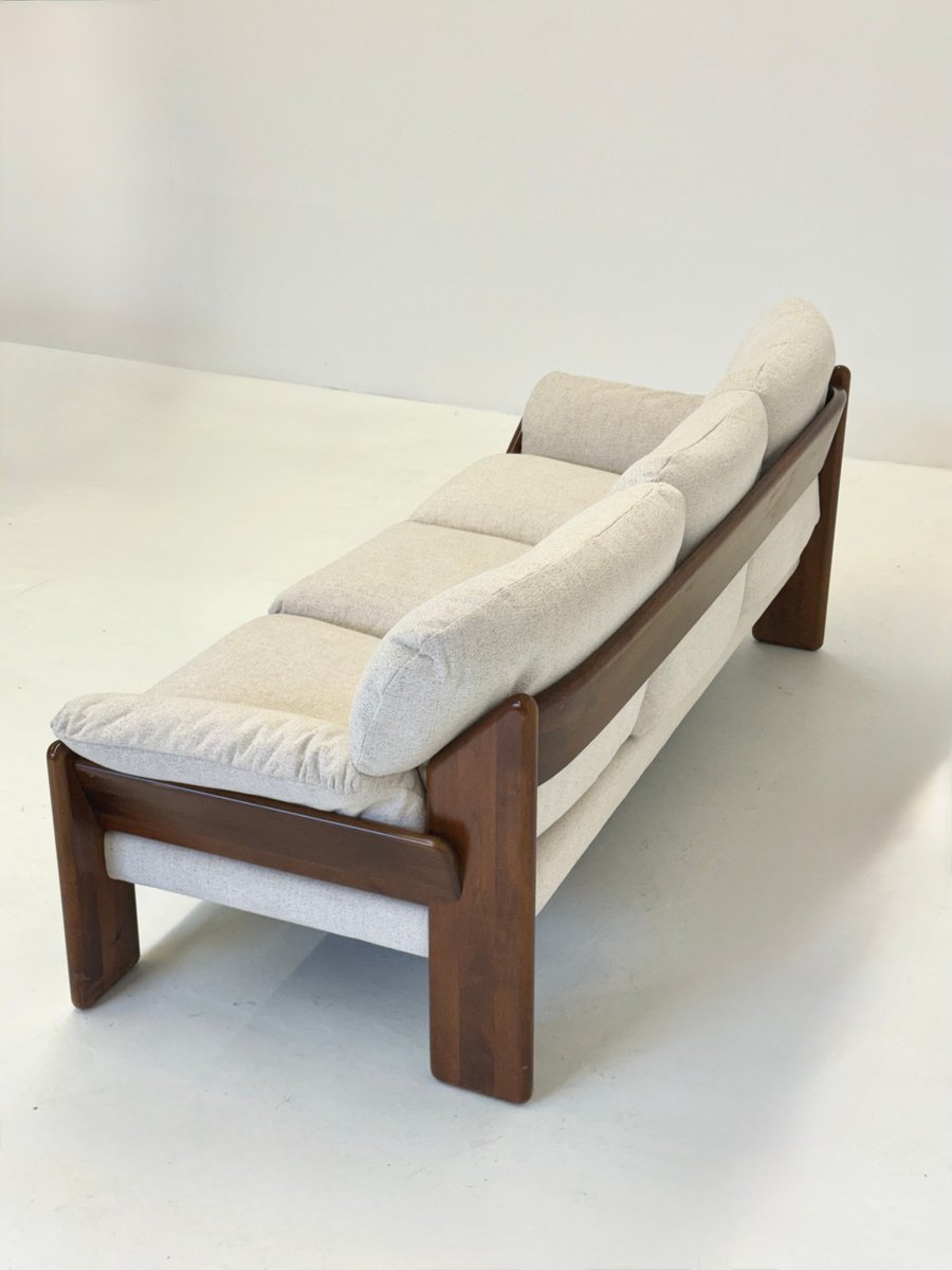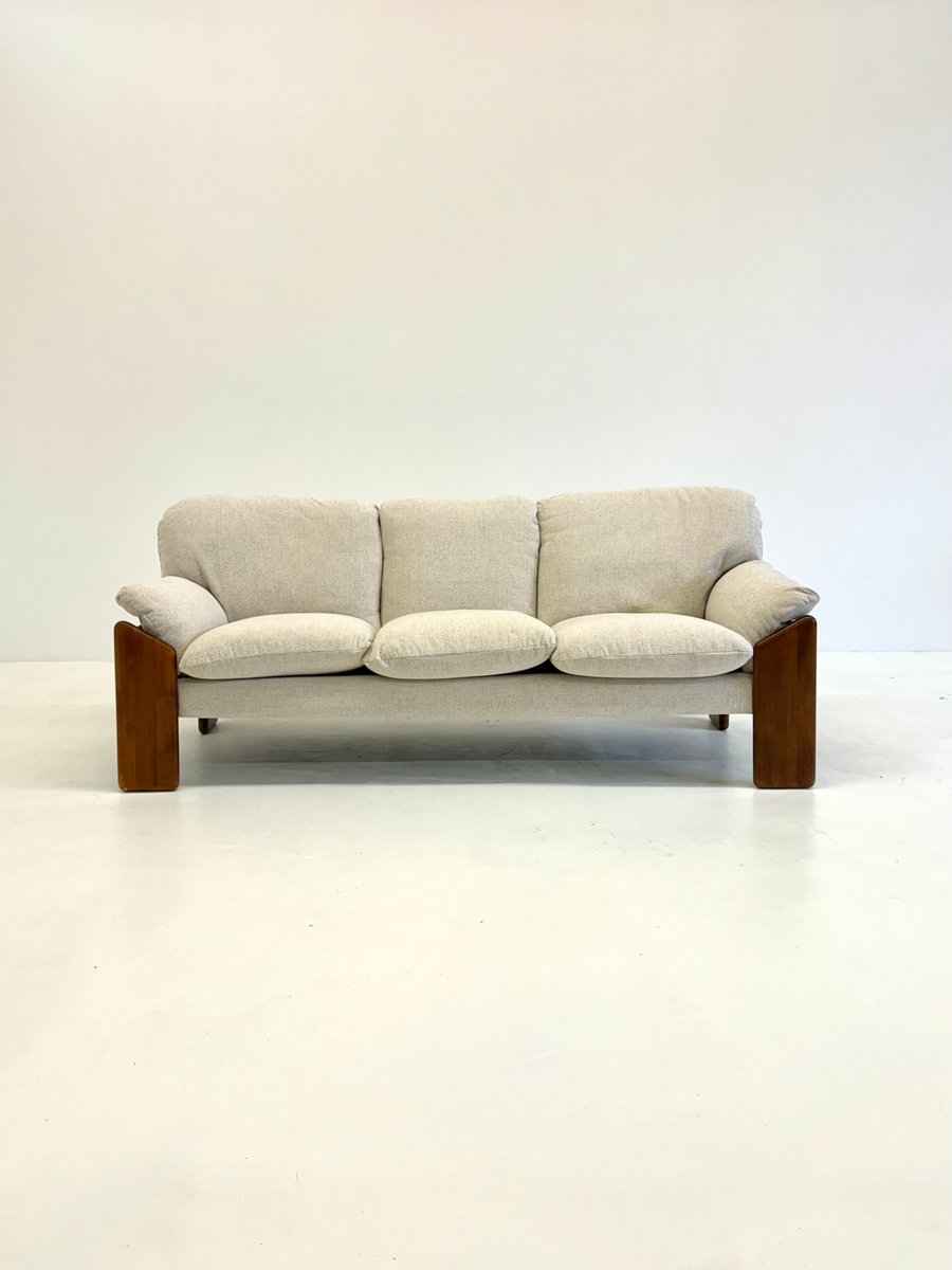 This three-seater sofa from the Sapporo line, designed in the 1970s by Mario Marenco for Mobil Girgi , is a beautiful example of Italian design from that period. The design combines clean lines with soft, inviting shapes. The angled front legs extend elegantly to the sides and back, while the gently curved backrest ensures optimal seating comfort.
