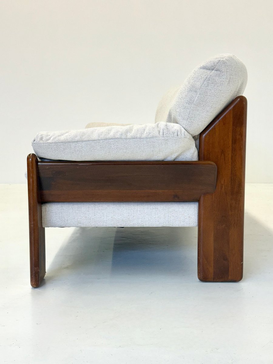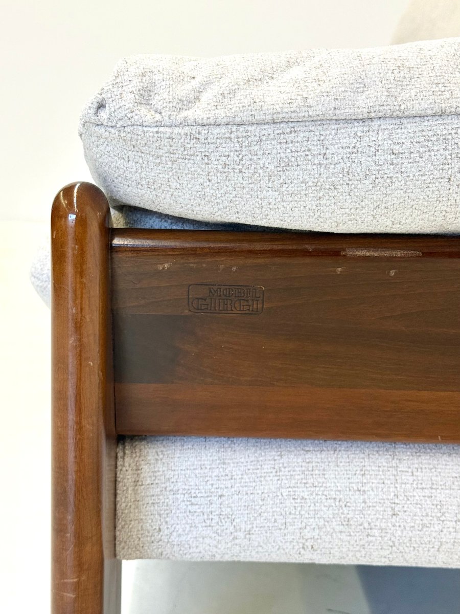 This version is upholstered in a high-quality cream/beige fabric, giving the sofa a refined and timeless look. The sturdy walnut frame remains visible on the sides and under the seats, where the sofa is also branded. A stylish and comfortable classic that adds warmth and elegance to any interior.
