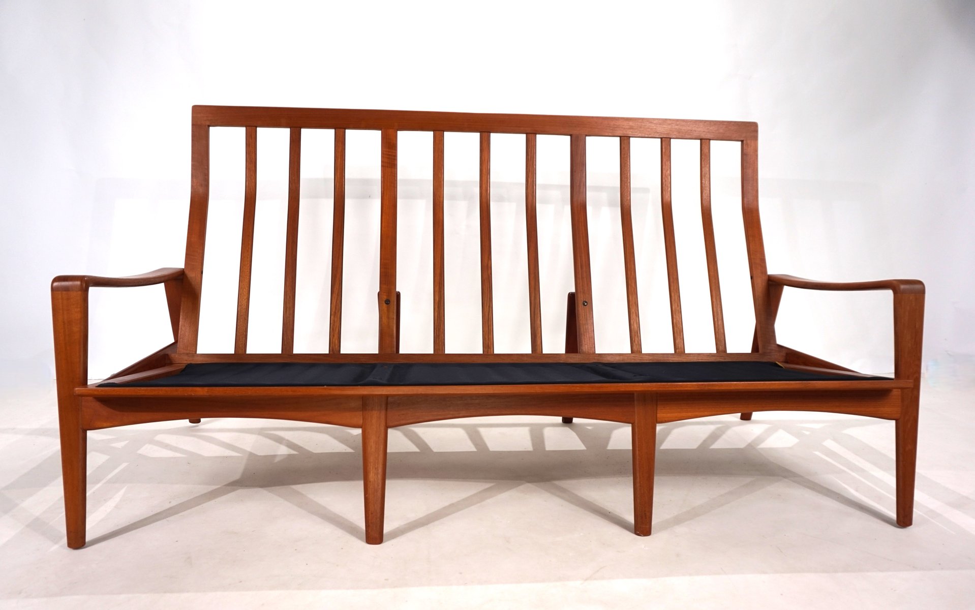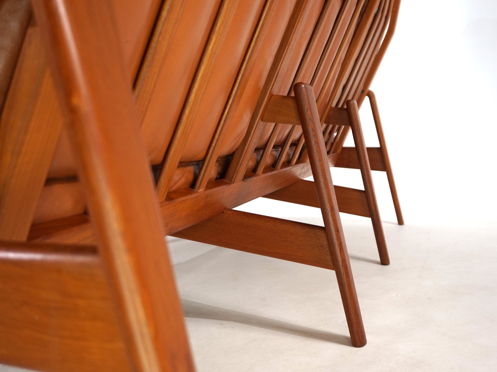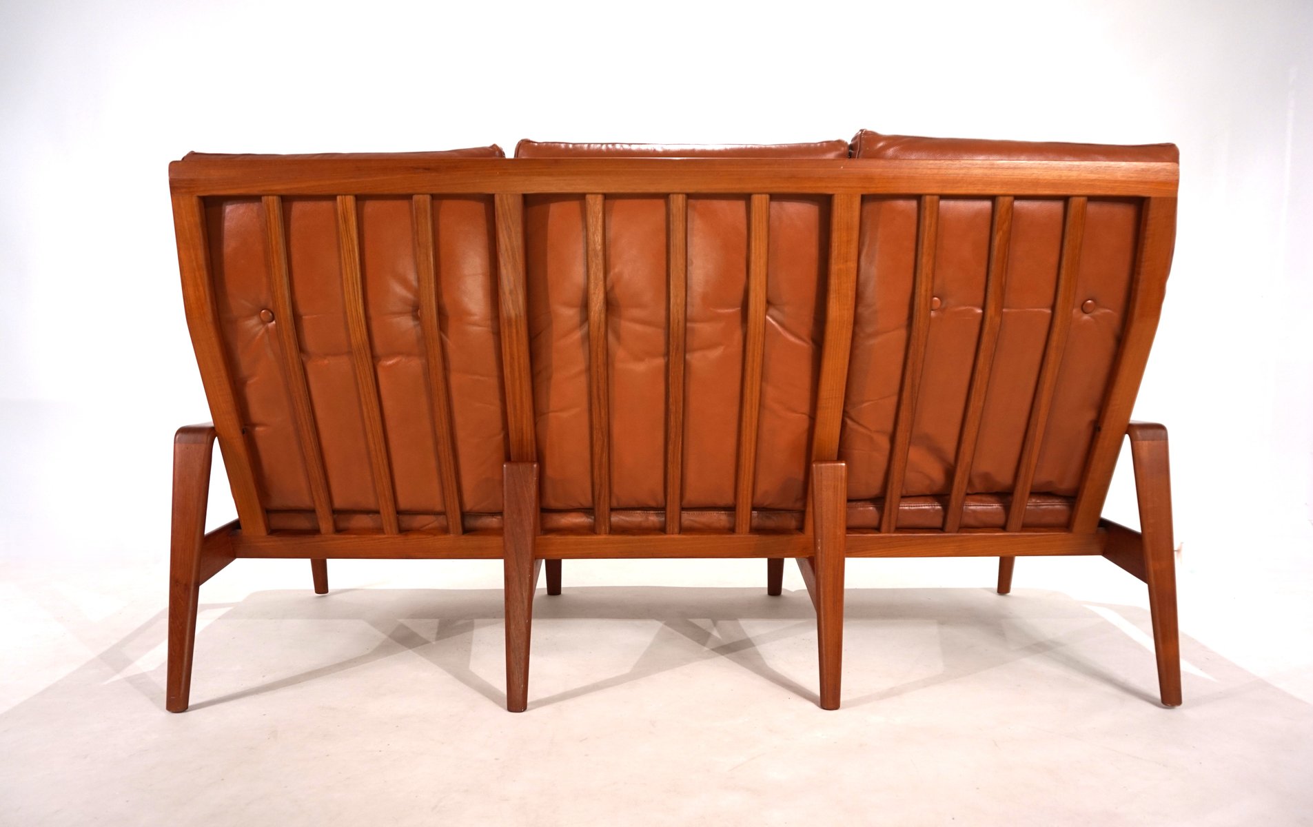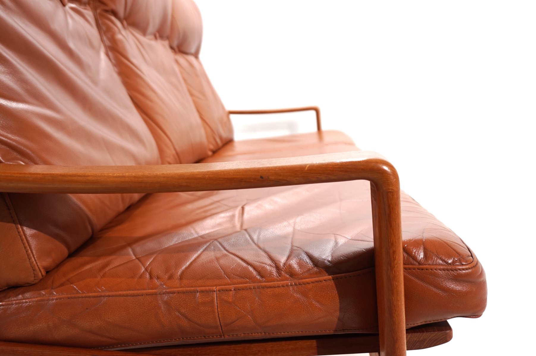 Este sofá de 3 plazas de Arne Wahl Iversen impresiona por sus formas orgánicas, que quedan muy bien en cualquier ambiente. El delicado armazón de teca de este sofá está en excelentes condiciones, por lo que resulta difícil decidir si se ve mejor por delante o por detrás. El cuero de color caramelo muestra una pátina ligera y atractiva y está en muy buenas condiciones. La suspensión del sofá está intacta y proporciona un cómodo asiento. Actualmente disponemos de un sillón a juego, también con respaldo alto.
