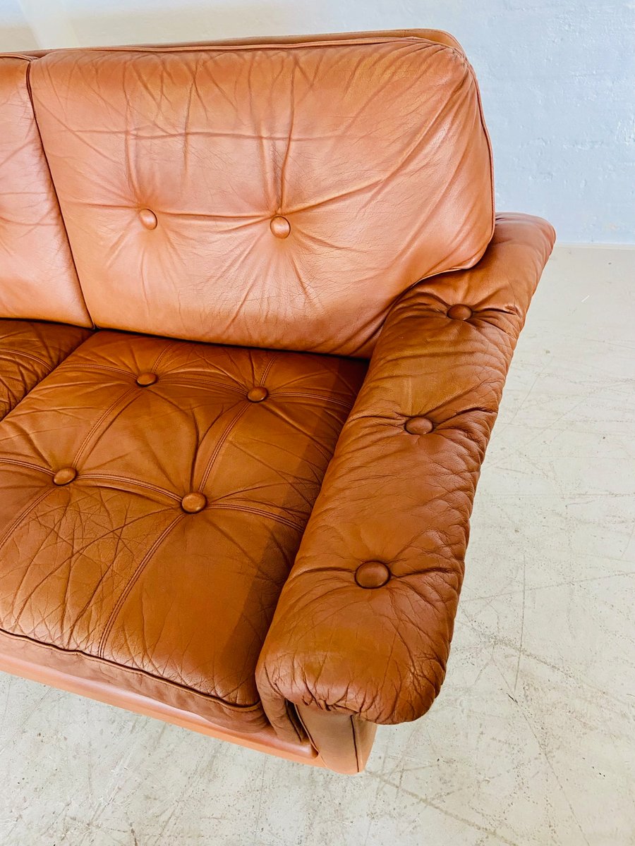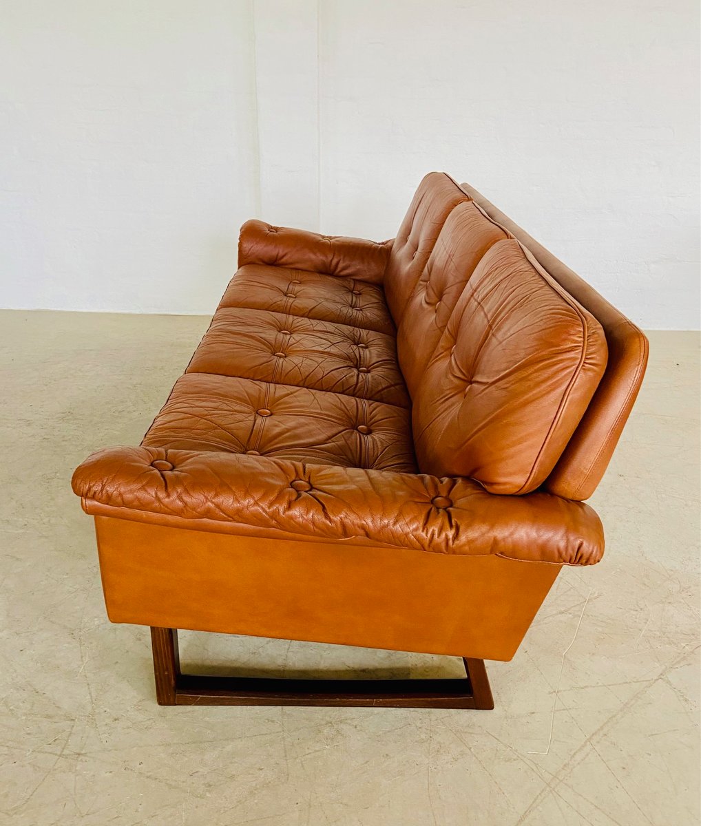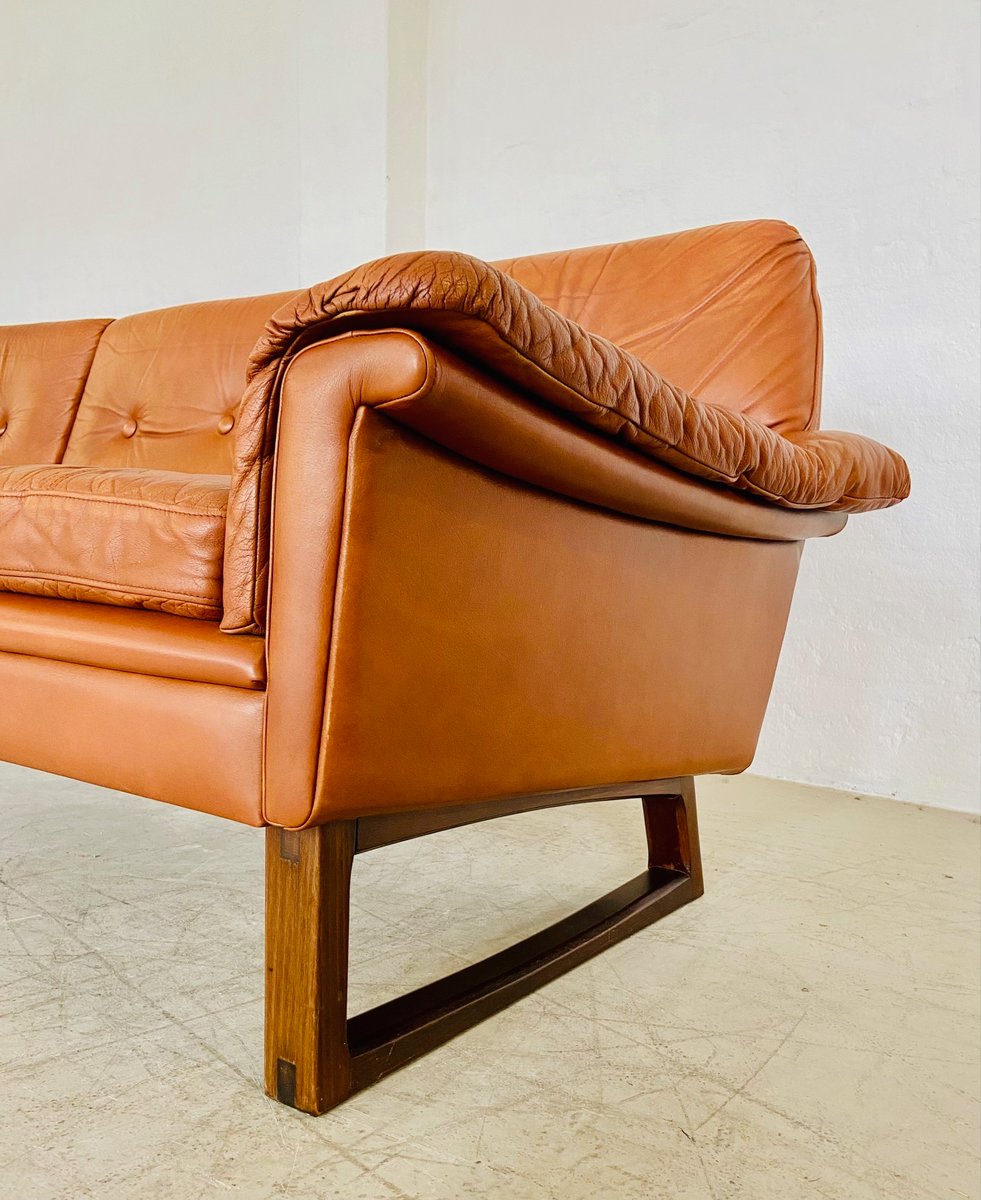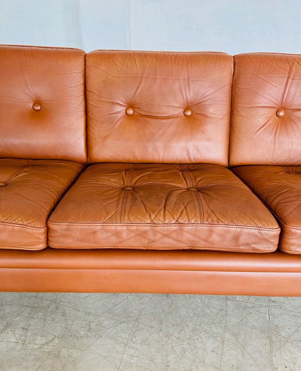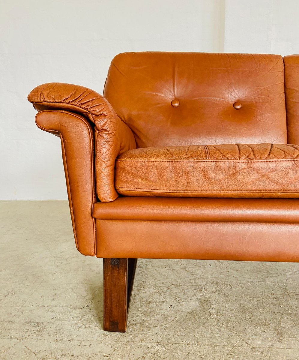 Sofá de tres plazas danés vintage de cuero coñac de Svend Skipper, años 70