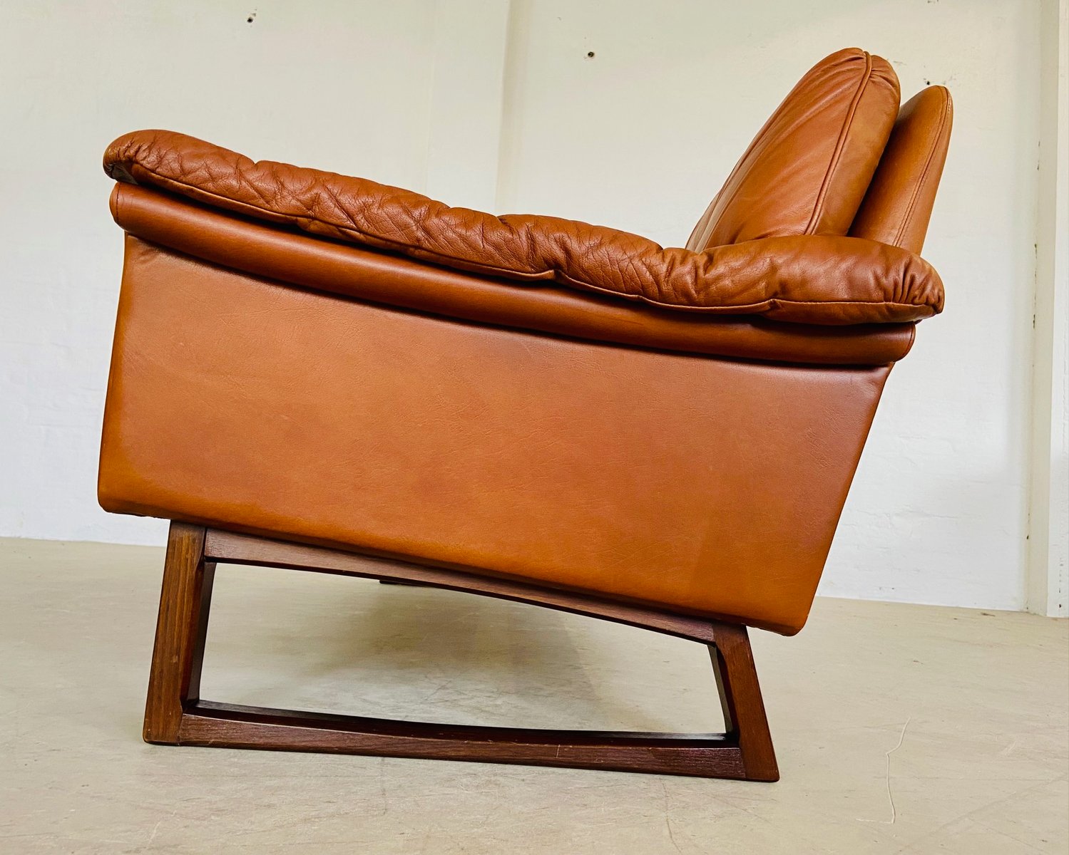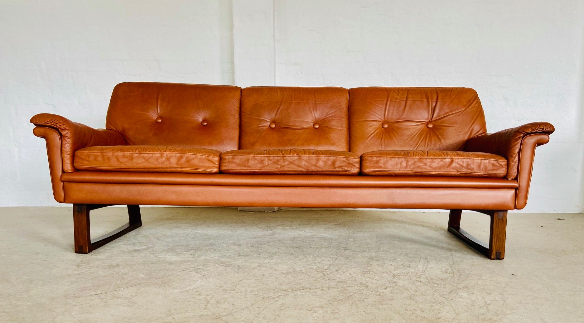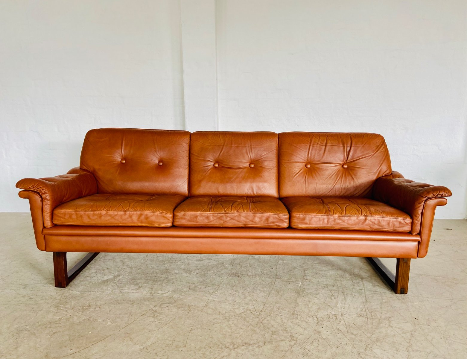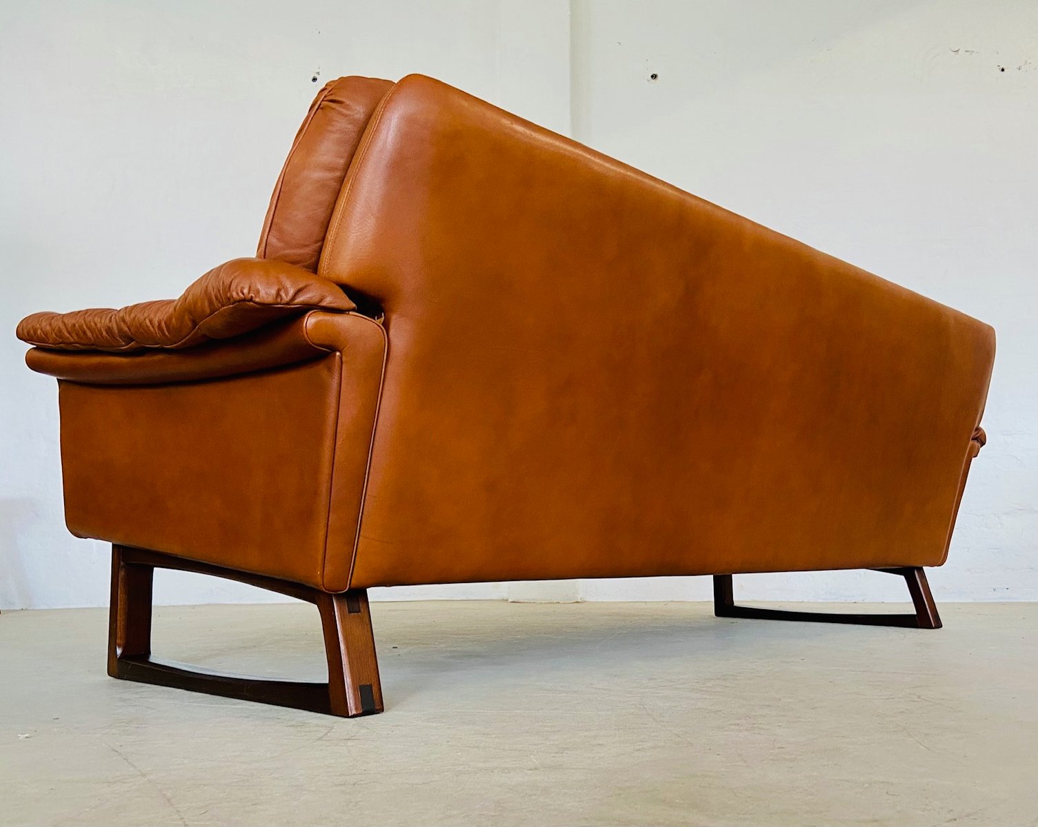 Sofá de tres plazas danés vintage de cuero coñac de Svend Skipper, años 70