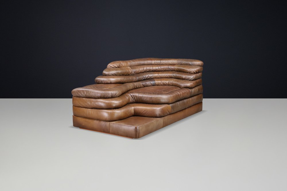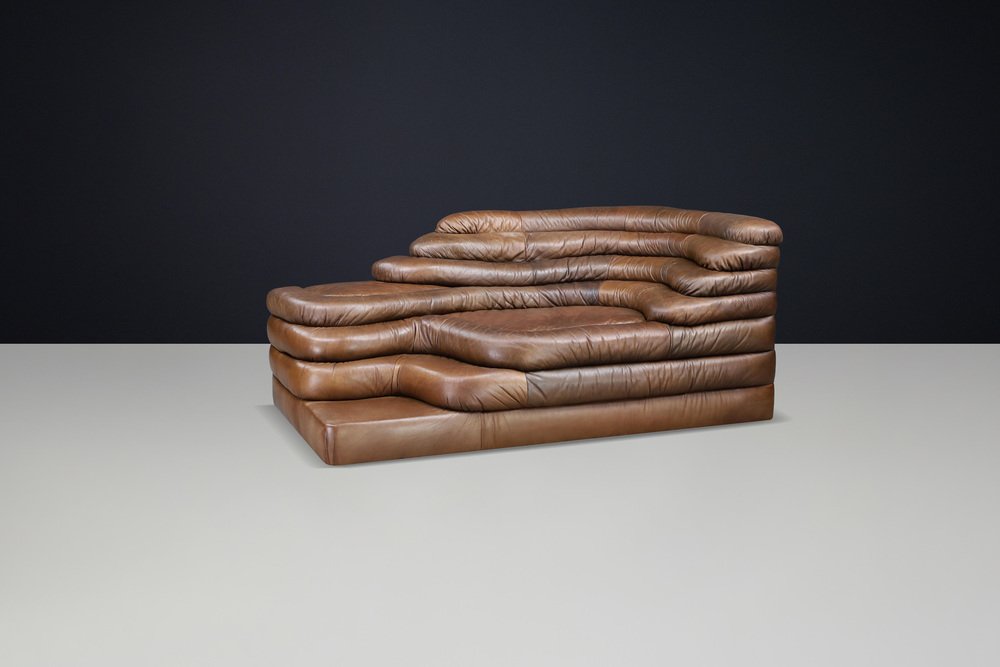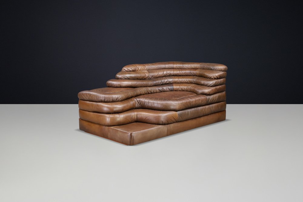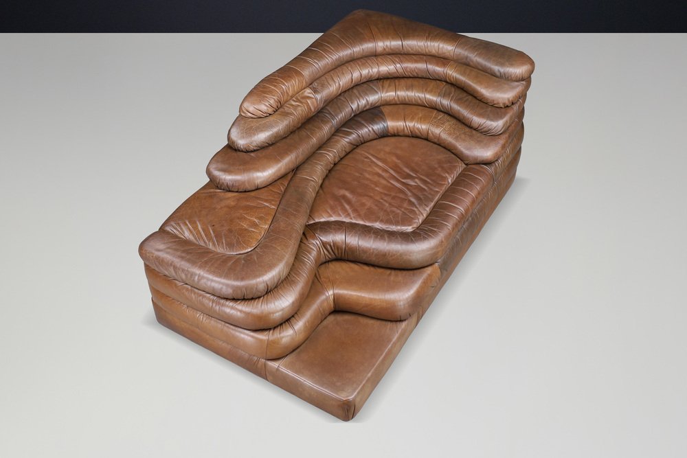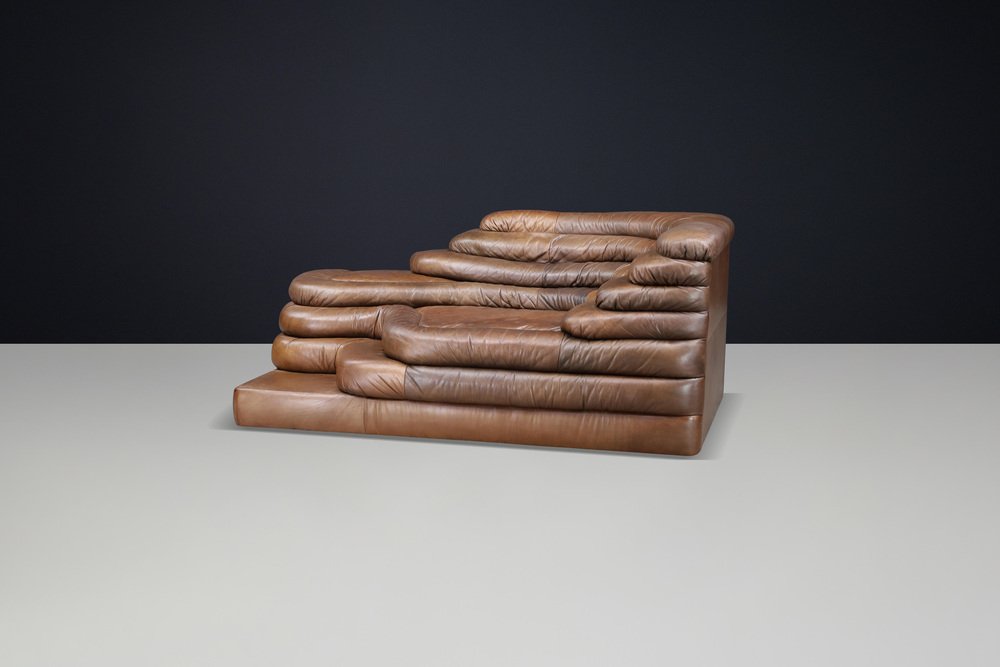 Ubald Klug for De Sede — DS-1025 “Terrazza” Sofa in Patinated Leather, 1970s Original DS-1025 “Terrazza” landscape sofa element by Ubald Klug for De Sede, Switzerland, 1970s. Iconic post-modern design in richly patinated brown leather with sculptural, layered contours. Designed by Ubald Klug for De Sede in the early 1970s, the DS-1025 “Terrazza” sofa remains one of the most recognizable icons of post-modern furniture design. Inspired by natural land formations and Italian amphitheatres, its stepped, terraced layers create an organic landscape that is both functional and sculptural. This authentic single element (1 × available) was produced by De Sede Switzerland circa the 1970s and is fully upholstered in its original high-quality brown leather. The leather shows a beautifully aged patina with natural colour variations, folds, and signs of use that highlight its vintage character. The exceptional craftsmanship and generous padding are characteristic of De Sede’s renowned Swiss quality, ensuring comfort as well as visual impact. Each “Terrazza” element can stand alone or be combined with other modules to form larger, flowing compositions—from daybeds to expansive lounge installations. Its sculptural profile and rich surface texture make it equally suitable for residential interiors, art spaces, or hotel lobbies seeking a statement piece. This example presents an appealing, even patina, minor wear consistent with age, and solid structure throughout. A rare opportunity to acquire an original DS-1025 in untouched vintage condition. Designer: Ubald Klug Manufacturer: De Sede, Switzerland Model: DS-1025 “Terrazza” Period: 1970s Style: Post-Modern Dimensions: Height 67 cm (26.38 in) Width 150 cm (59.06 in) Depth 89 cm (35.04 in) Seat height 35.5 cm (13.98 in) Materials: Patinated brown leather Condition: Good original condition with beautiful patina; minor wear consistent with age.