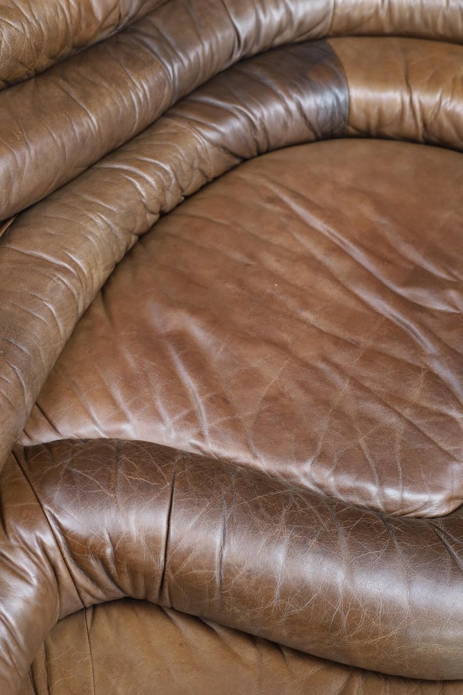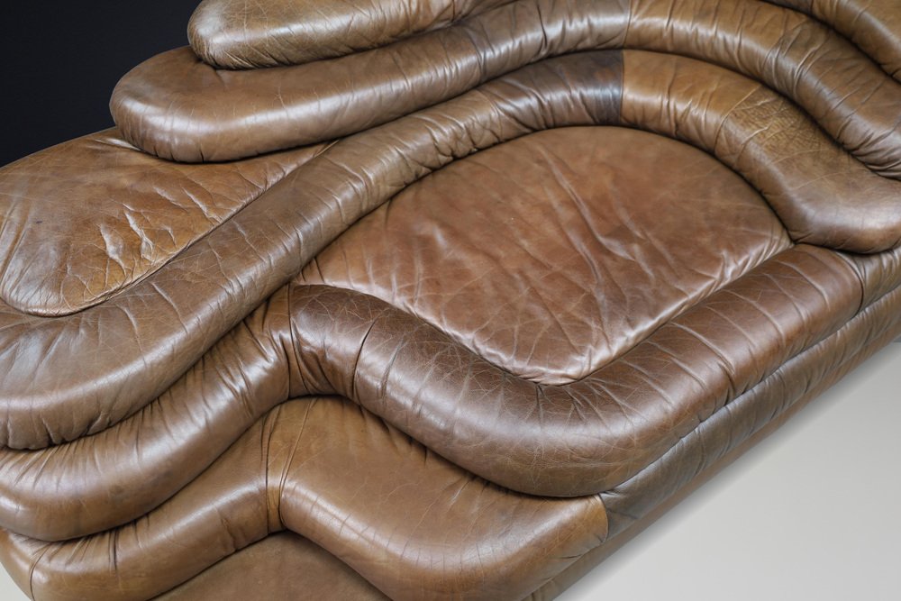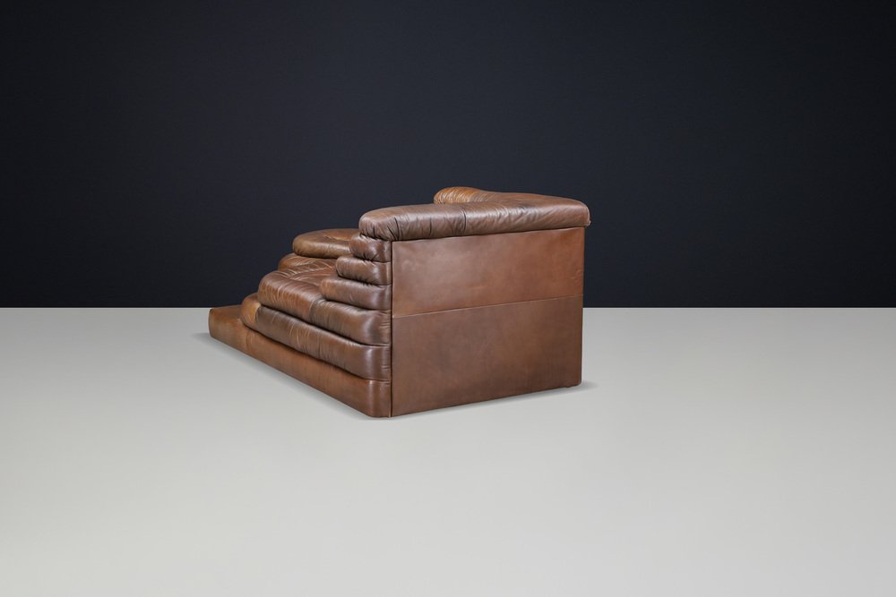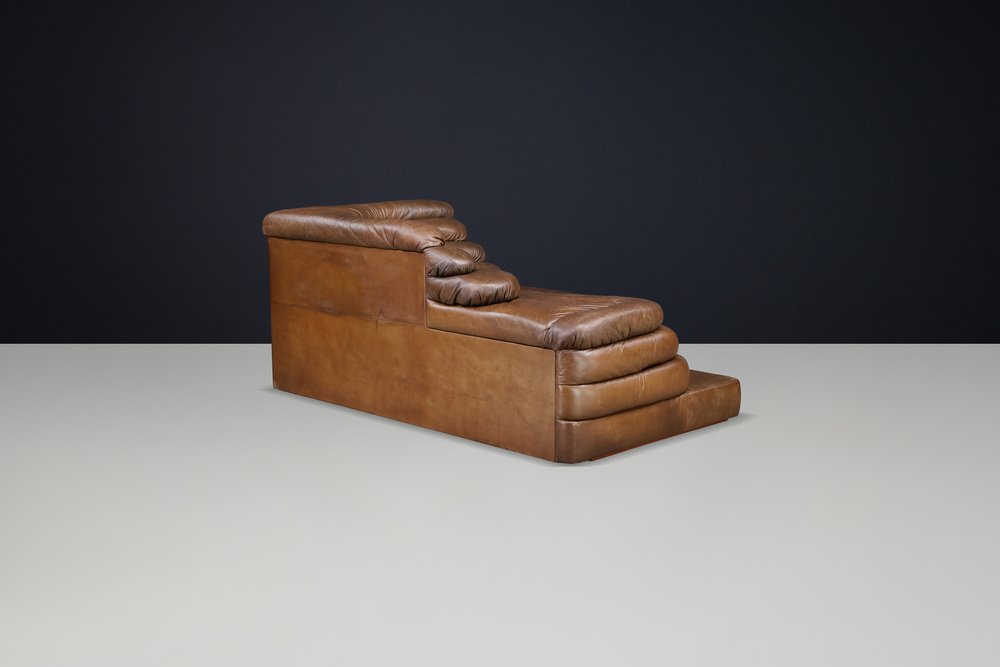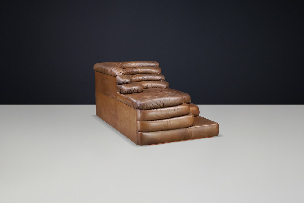 Ubald Klug for De Sede — DS-1025 “Terrazza” Sofa in Patinated Leather, 1970s Original DS-1025 “Terrazza” landscape sofa element by Ubald Klug for De Sede, Switzerland, 1970s. Iconic post-modern design in richly patinated brown leather with sculptural, layered contours. Designed by Ubald Klug for De Sede in the early 1970s, the DS-1025 “Terrazza” sofa remains one of the most recognizable icons of post-modern furniture design. Inspired by natural land formations and Italian amphitheatres, its stepped, terraced layers create an organic landscape that is both functional and sculptural. This authentic single element (1 × available) was produced by De Sede Switzerland circa the 1970s and is fully upholstered in its original high-quality brown leather. The leather shows a beautifully aged patina with natural colour variations, folds, and signs of use that highlight its vintage character. The exceptional craftsmanship and generous padding are characteristic of De Sede’s renowned Swiss quality, ensuring comfort as well as visual impact. Each “Terrazza” element can stand alone or be combined with other modules to form larger, flowing compositions—from daybeds to expansive lounge installations. Its sculptural profile and rich surface texture make it equally suitable for residential interiors, art spaces, or hotel lobbies seeking a statement piece. This example presents an appealing, even patina, minor wear consistent with age, and solid structure throughout. A rare opportunity to acquire an original DS-1025 in untouched vintage condition. Designer: Ubald Klug Manufacturer: De Sede, Switzerland Model: DS-1025 “Terrazza” Period: 1970s Style: Post-Modern Dimensions: Height 67 cm (26.38 in) Width 150 cm (59.06 in) Depth 89 cm (35.04 in) Seat height 35.5 cm (13.98 in) Materials: Patinated brown leather Condition: Good original condition with beautiful patina; minor wear consistent with age.
