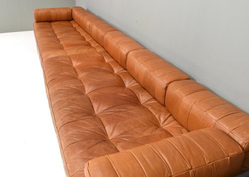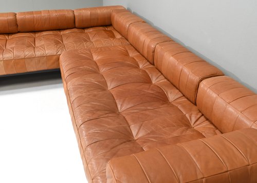Introducing this gorgeous center piece Cognac Brown DS80 patchwork sofas by De Sede. The arm and back supports made in lacquer wood can be moved to left to right and back and front for different set-ups in use. In exceptionaly good 1970s original condition. And the leather has not even be cleaned and waxed again. Not used extensively over the years. No smoke, no animals. The sofas features 12 pieces: – 2 wood frames – 2 seat cushions – 8 back cushions