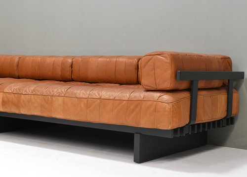 Designer: De Sede design team Manufacturer: De Sede Country: Switzerland Model: DS80 daybed sofas Design period: circa 1970 Date of manufacturing: circa 1970 Size WxDxH:per sofa 205x95x65 seat height 41 Condition: Very good / Small repaired hole in the back of one of the seat cushions (see images) / Patinated leather which has not been cleaned or waxed / The sofas are eye-catchers!