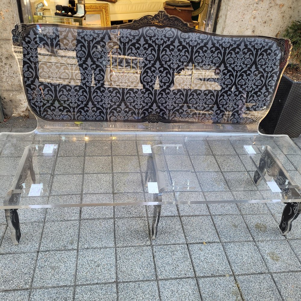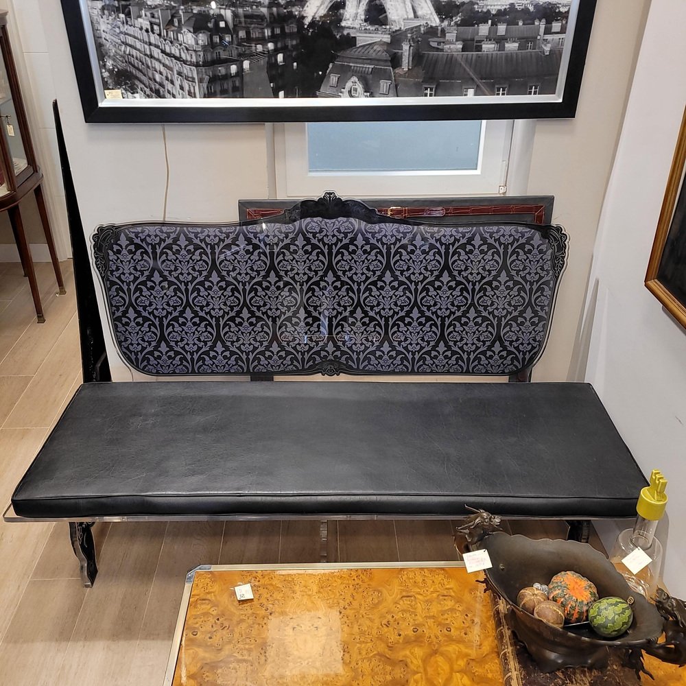 Sofá Acrila único en su género, Francia circa 2009, llamado NEOBARROCO, porque el estampado es un damasco negro y gris con impronta barroca. El estampado se extiende por todo el respaldo y las patas, consiguiendo una simbiosis única de tradición y modernidad. Cuenta con un cojín de cuero negro que realza aún más la sofisticación de la pieza.