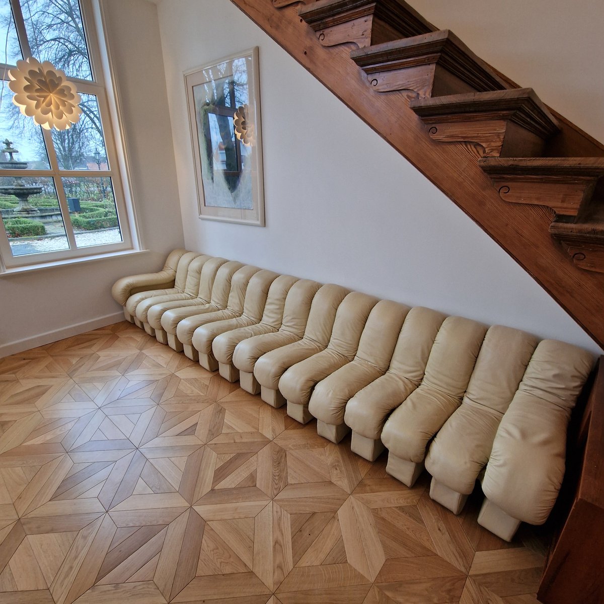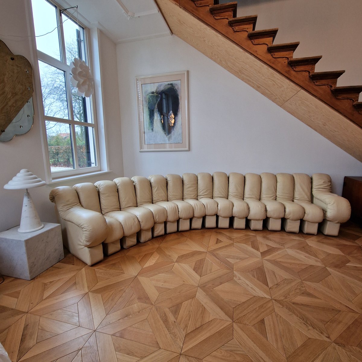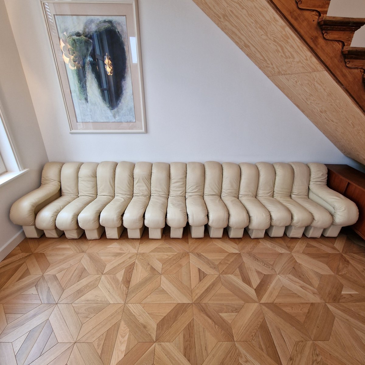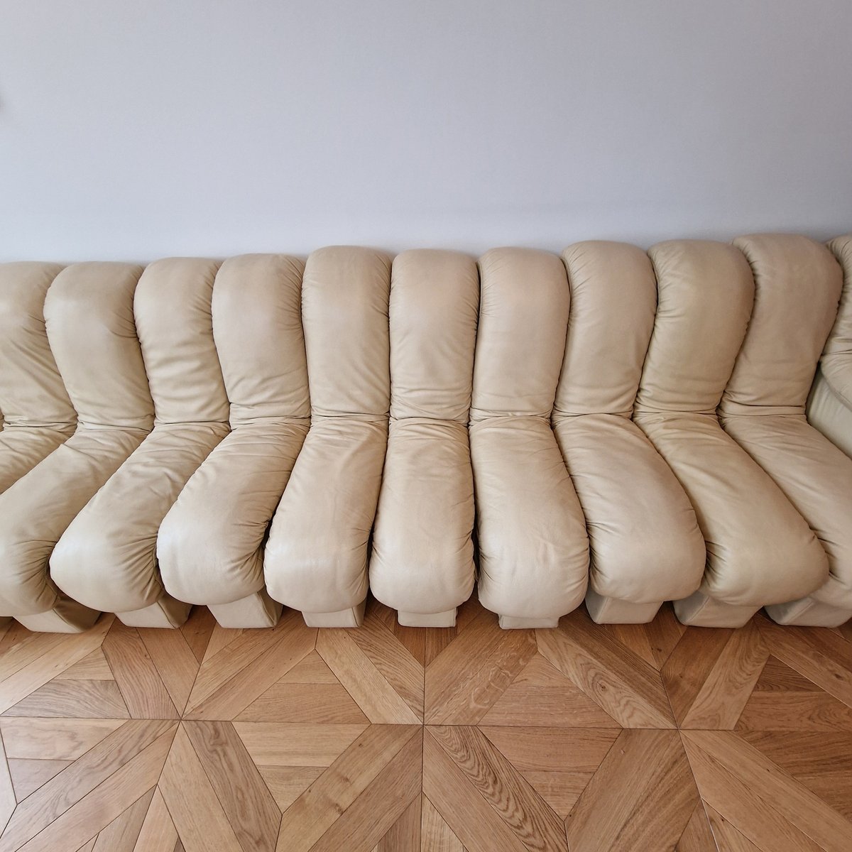 This stunning sofa consists of 16 full leather modular parts, color cream or ivory.