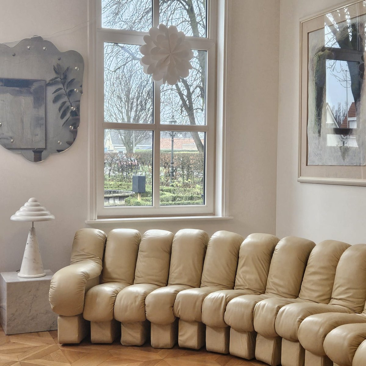 Este impresionante sofá consta de 16 piezas modulares de cuero integral, de color crema o marfil.