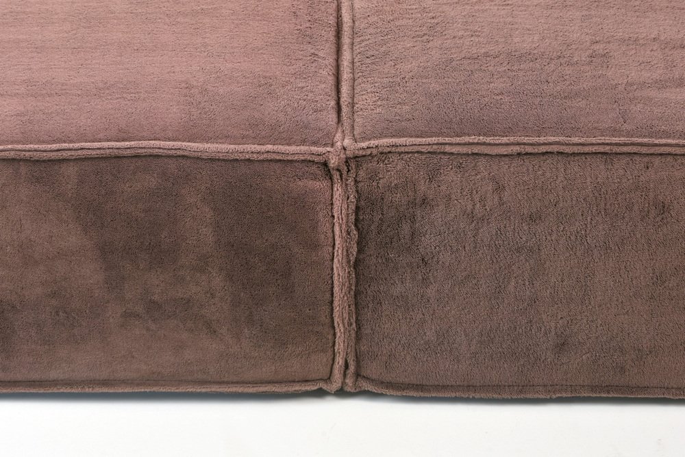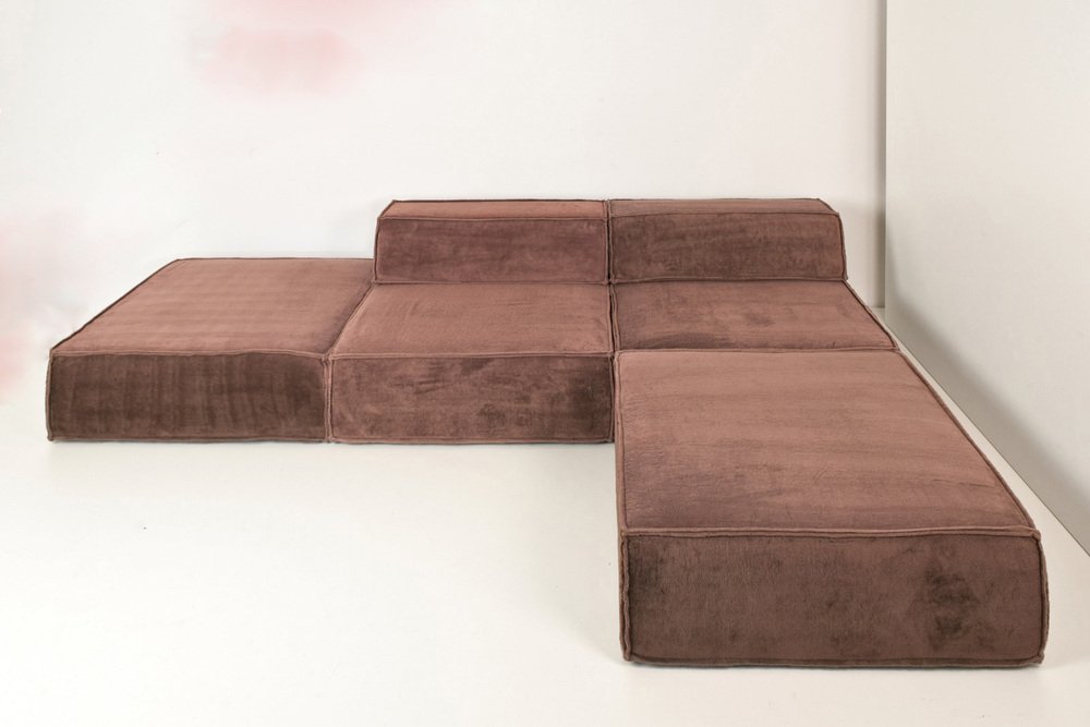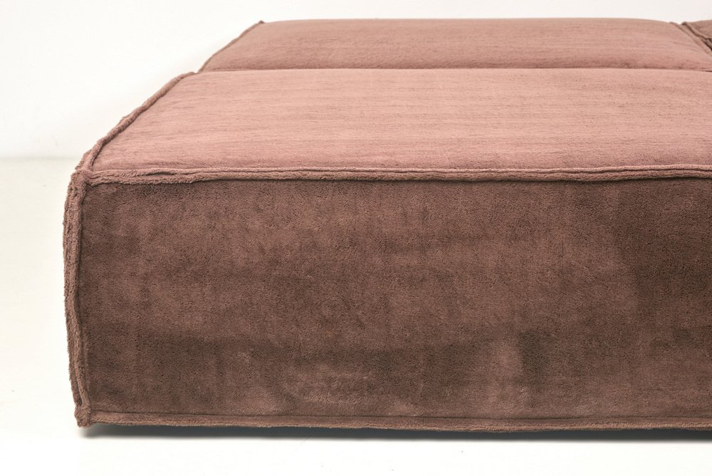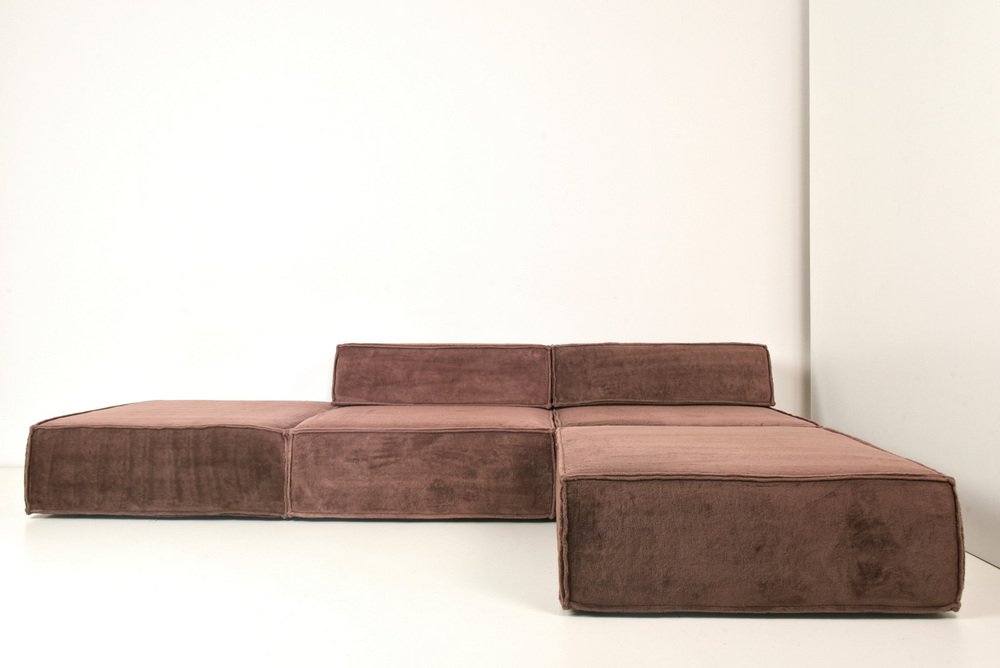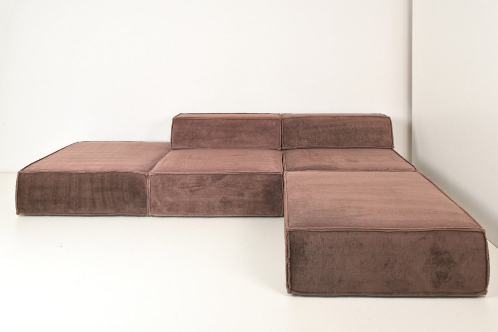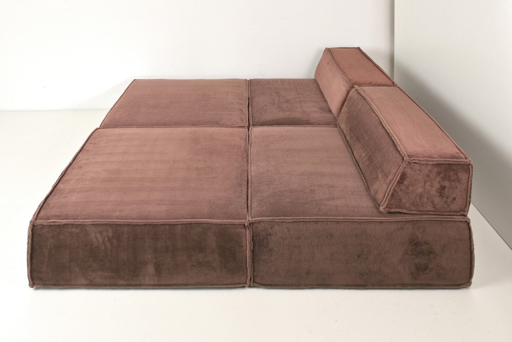 The modular sofa TRIO from COR, designed by TEAMFORM AG Switzerland, represents the avant-garde in living. with a large number of modules, freely positionable living landscapes could also be created. Our sofa consists of 4 modules 96 x 96 cm H 35 and 2 back wedges. The wedges carry a stopper fabric from below so that the position of the wedge is maintained as much as possible. Our sofa with the thick, warm TEDDY fabric has just been professionally cleaned. There are slight fadings from the light, flat and even. It comes from a well-kept previous owner.