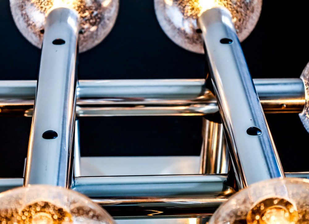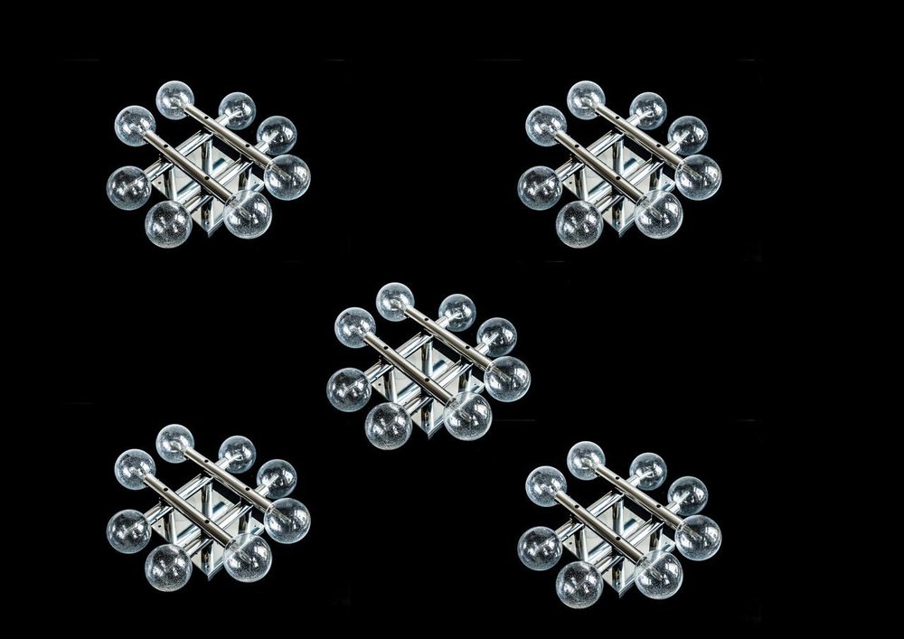 1 of 5 Original 1960s J.T. Kalmar, Austrian exclusive chrome polished, Atomium space age Flush Mounts with 8 bubble glass, mouth-blown, structured, glas globes, by Kalmar Leuchten in the late the 1960s. These RS versions where part of an old Berlin cinema and ave been designed especially for this location. The 8 globe flush mount with larger globes ( 5,9 Inch) is a very rare find. All 5 items are in great original working condition with mint globes, no chips or crack and shiny chrome, nickeled metal front plates and parts.