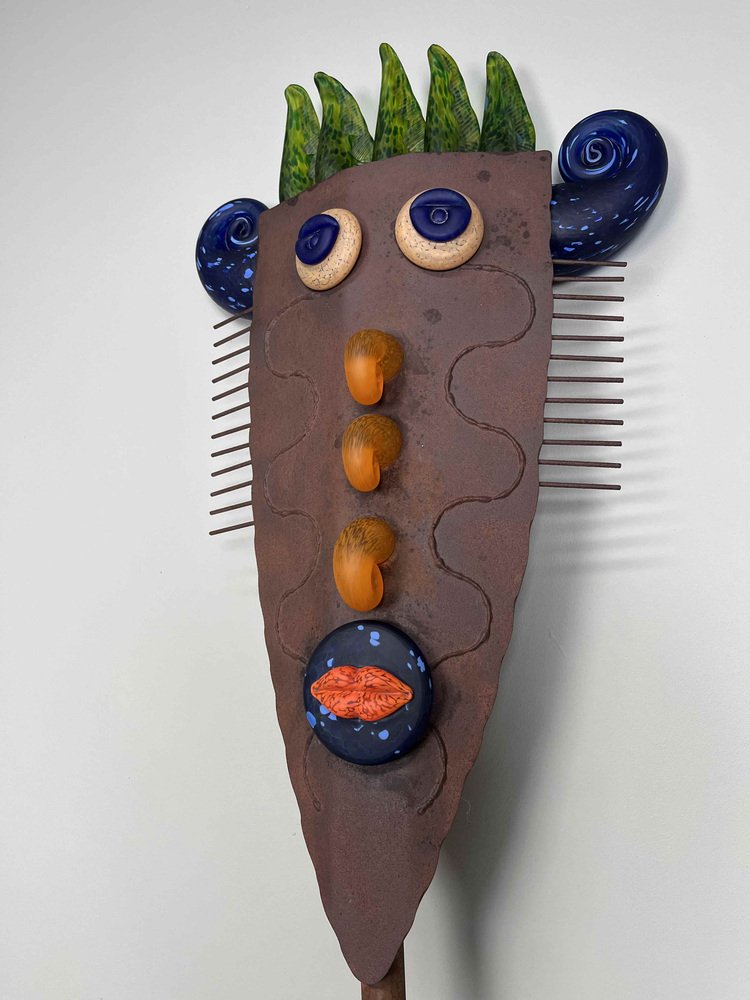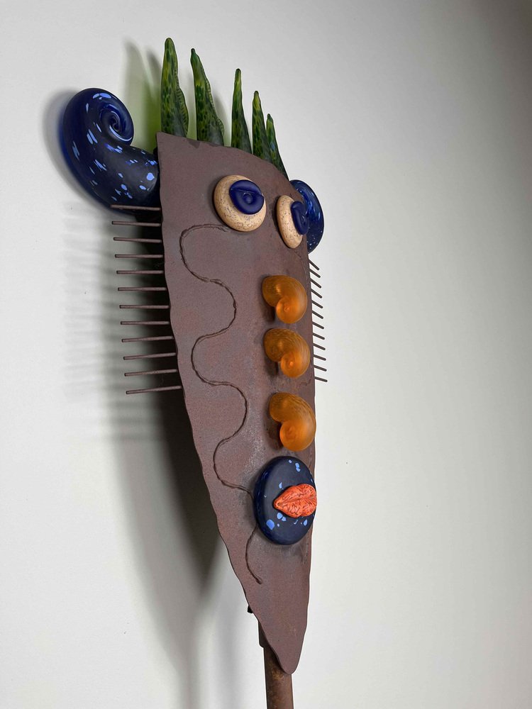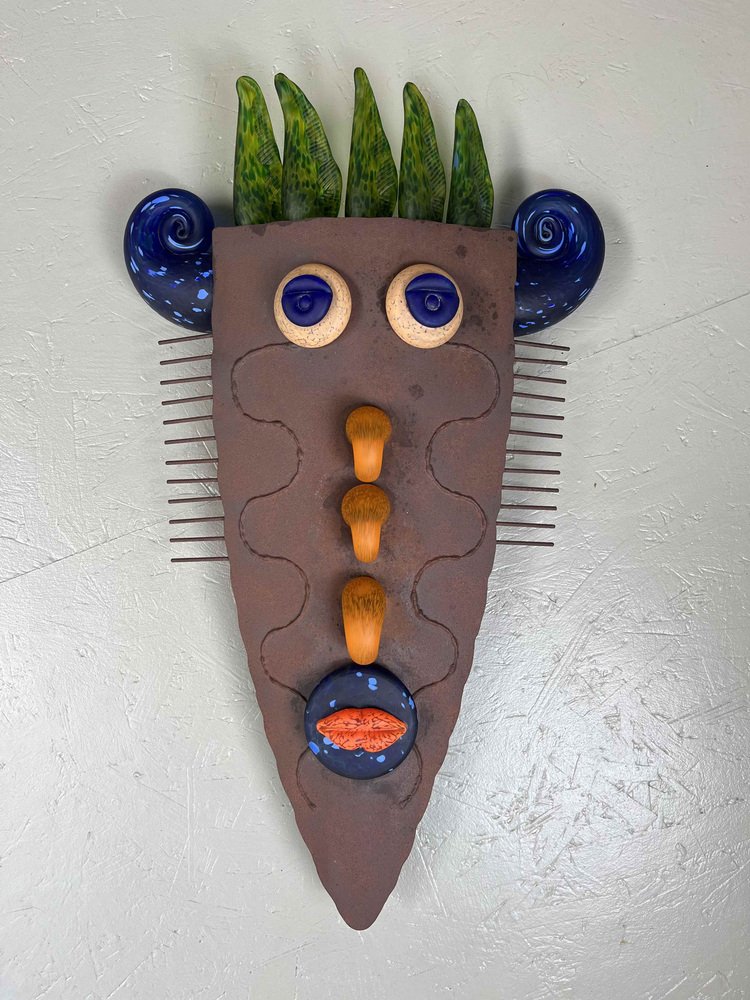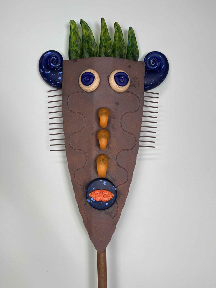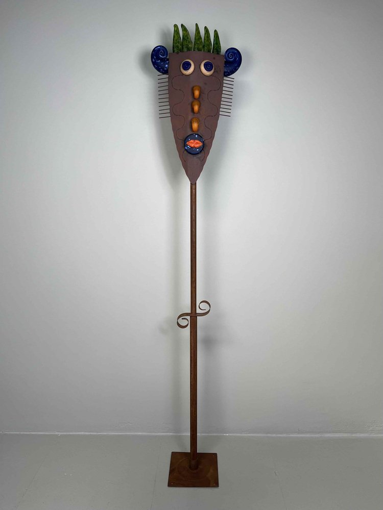 This versatile artwork can be used both indoors and outdoors. The mask can be mounted on the stand or hung directly on a wall. The stand is equipped with eyelets for secure mounting on a stable surface or pedestal.