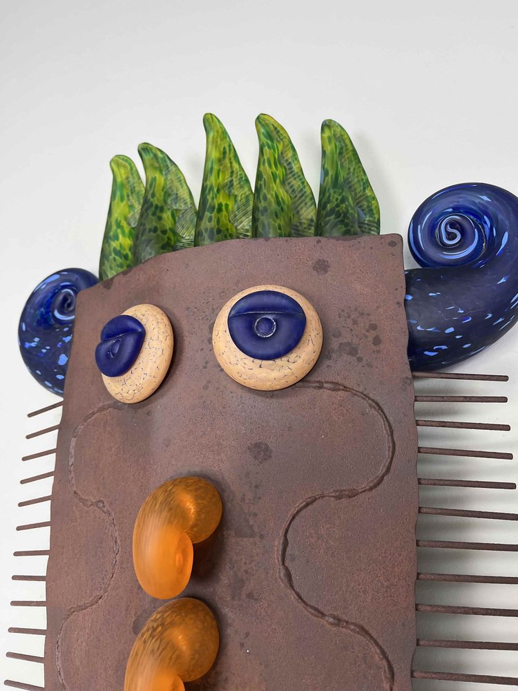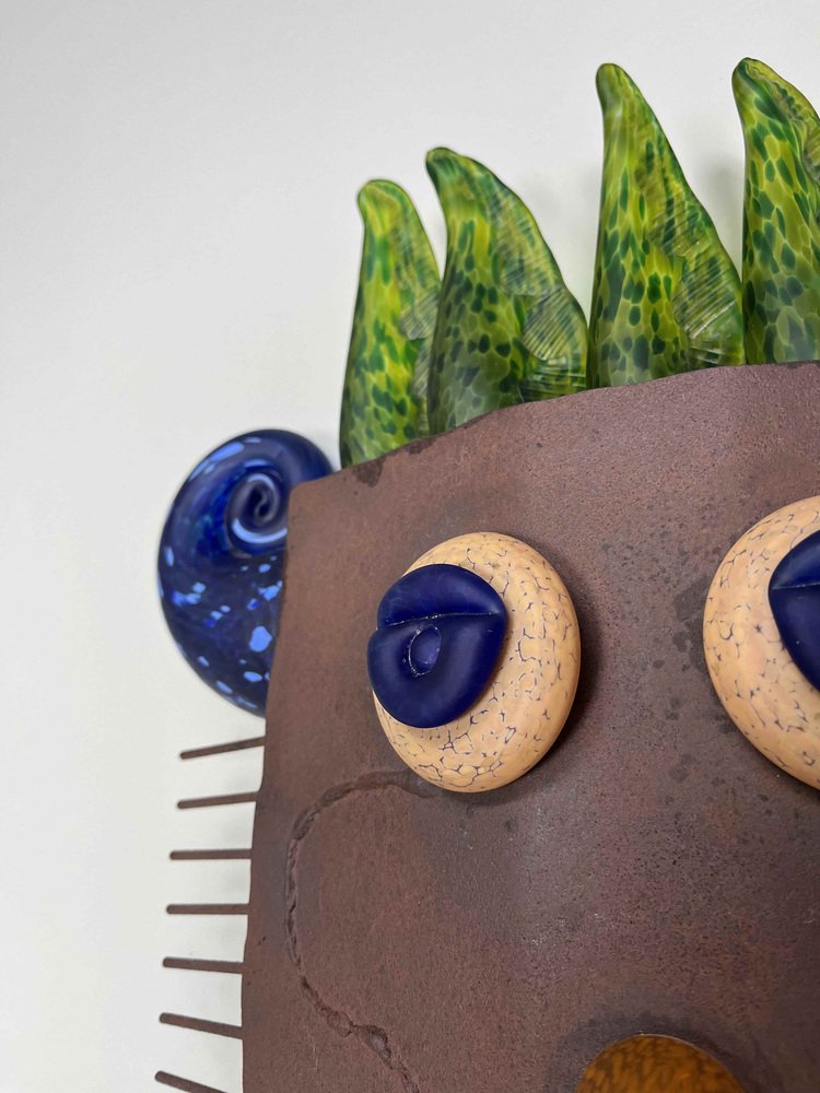 Esta impresionante y colorida cabeza de fantasía, hecha de vidrio y metal, se atribuye a Borowski Glass, un renombrado estudio de vidrio conocido por sus obras de arte únicas y juguetonas. La cabeza de fantasía viene con un soporte de metal a juego, por lo que es a la vez funcional y decorativa.