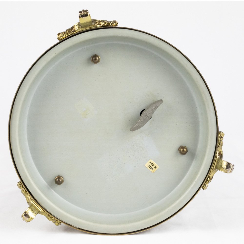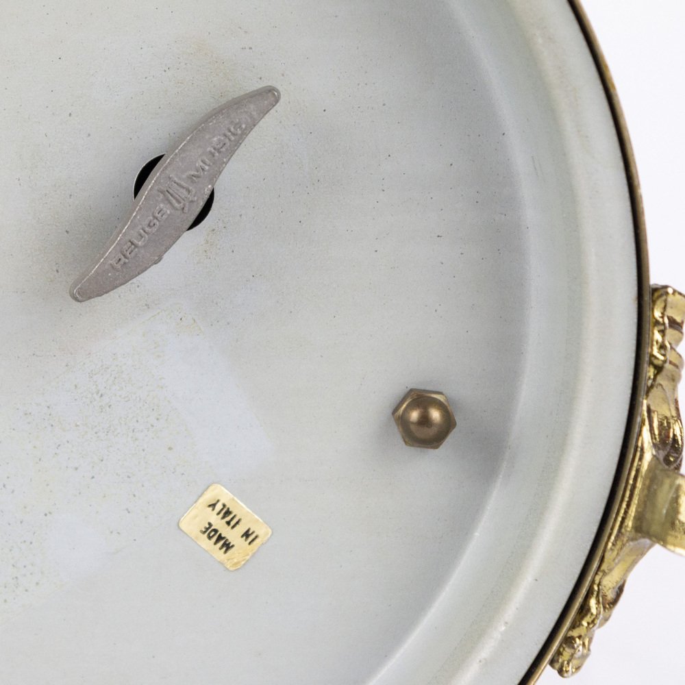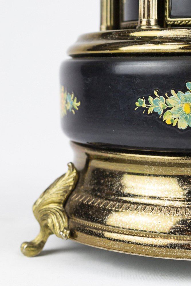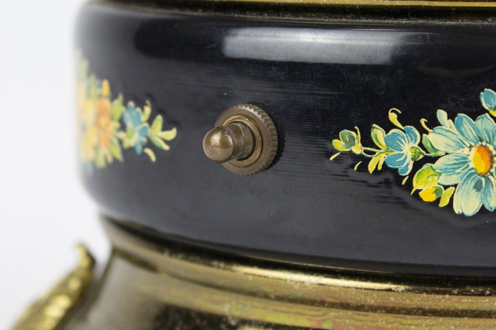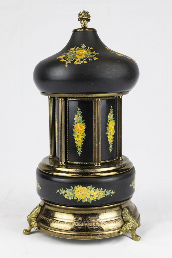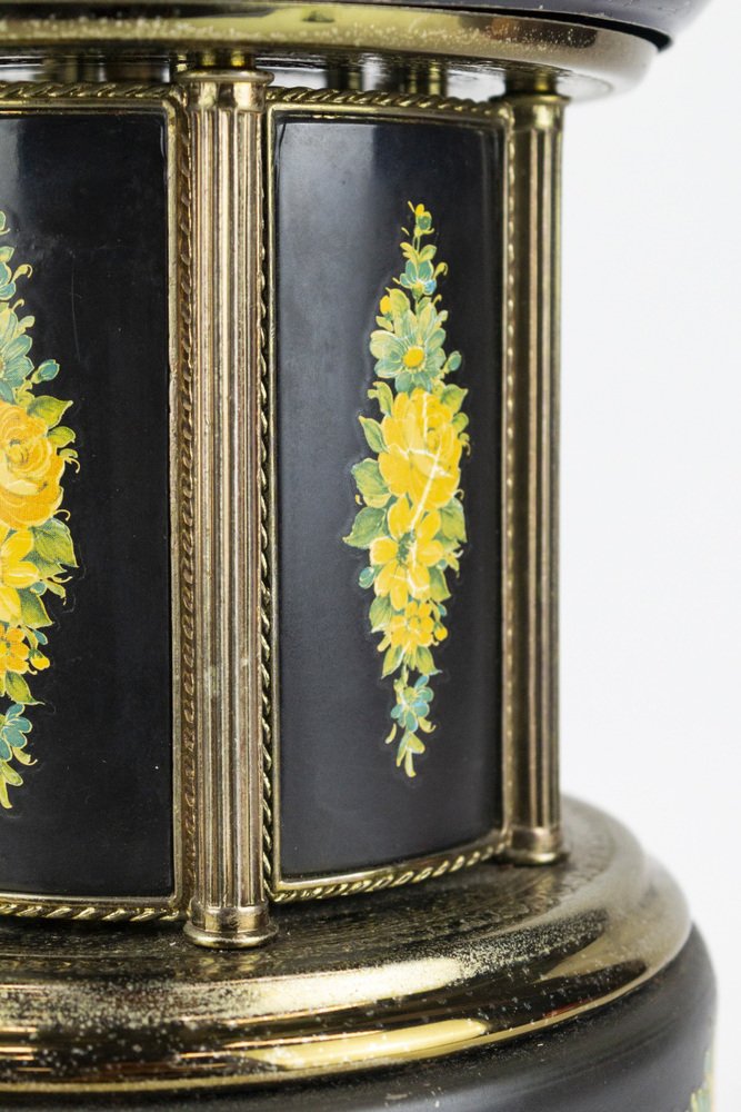Caja de música con mecanismo suizo Reuge, de metal esmaltado con adornos florales, fabricada en Italia. Las pitilleras situadas a los lados de la caja de música se abren cuando se activa el mecanismo.