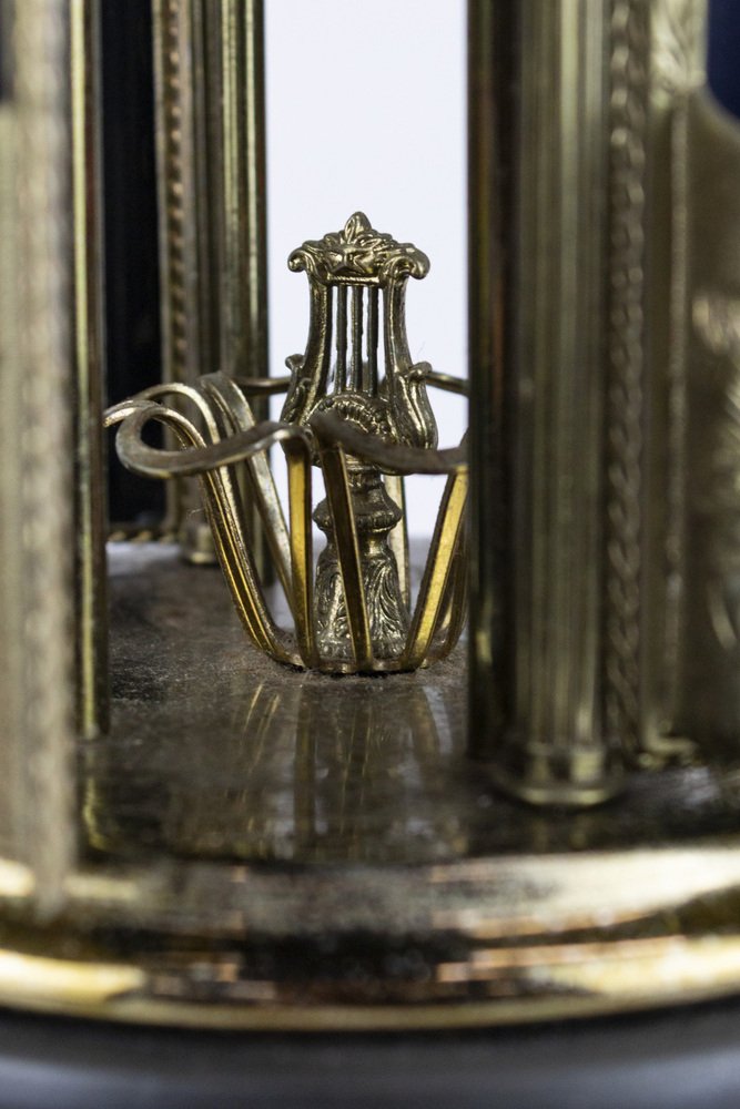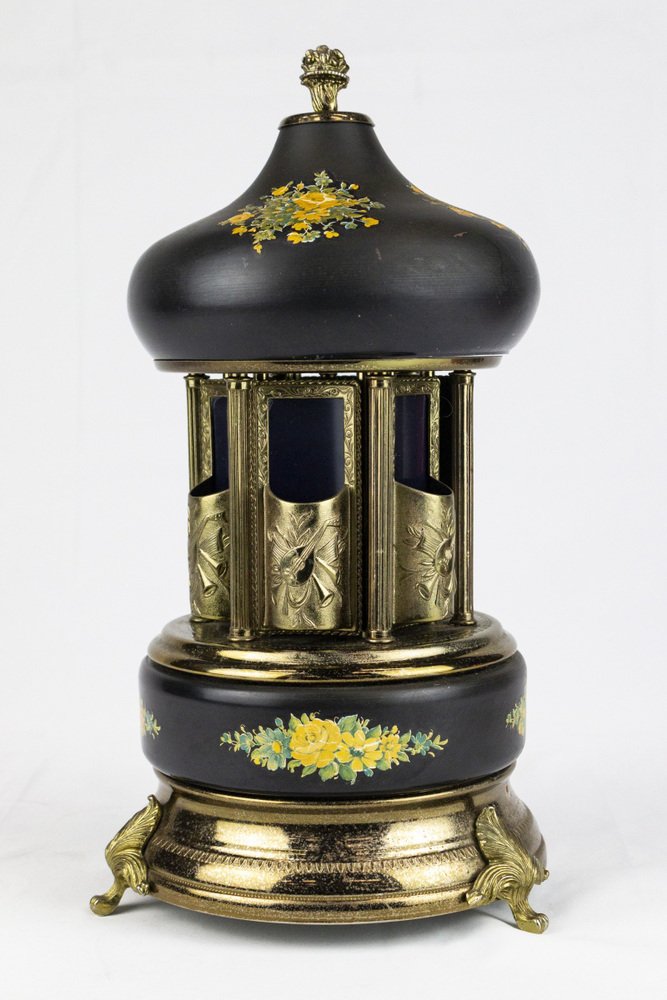 The winding key is located under the base, and the button that activates the music and movement is on one side.