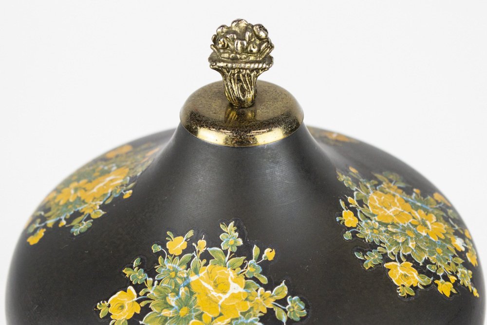 Music box with Swiss Reuge mechanism, made of enameled metal with floral decorations, made in Italy. Cigarette holders along the sides of the music box open when the mechanism is activated.