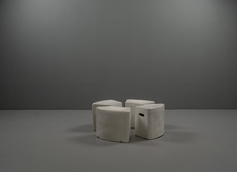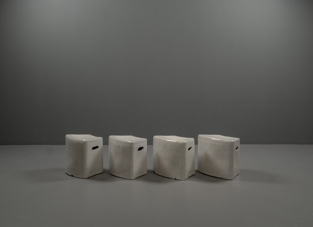 The 4 postmodern stools made of glazed enamelled ceramic in natural white, with recessed handles on the left and right.