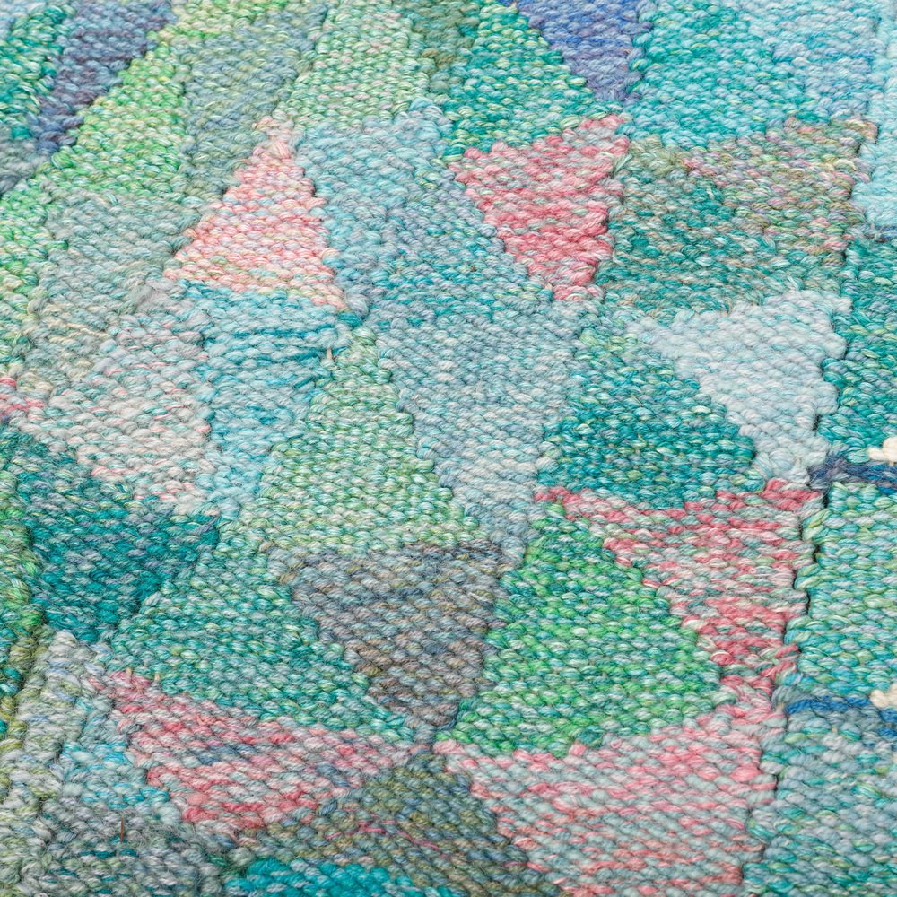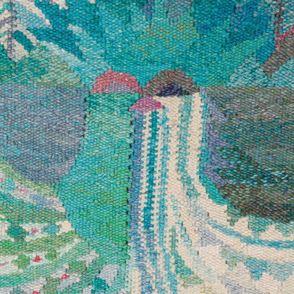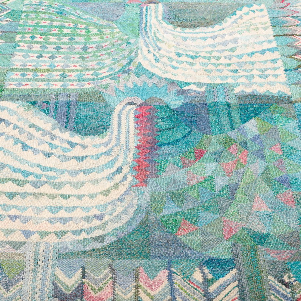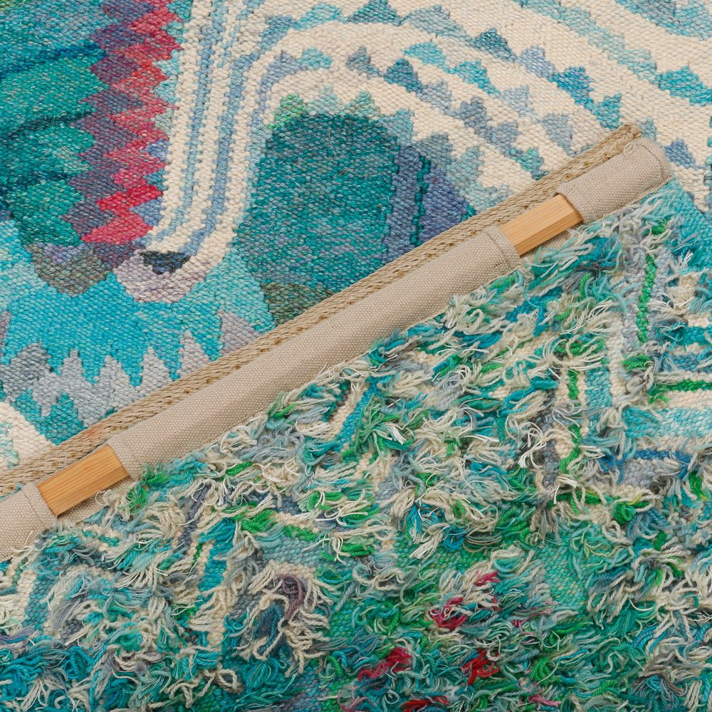 La diseñadora lleva las iniciales MR de Marianne Richter en la esquina inferior derecha y la productora AB Märta Måås-Fjetterströms las iniciales ABMMF en la esquina inferior izquierda. El tapiz está en muy buen estado, con un desgaste mínimo propio de la edad. Tamaño: 176 x 160 cm.