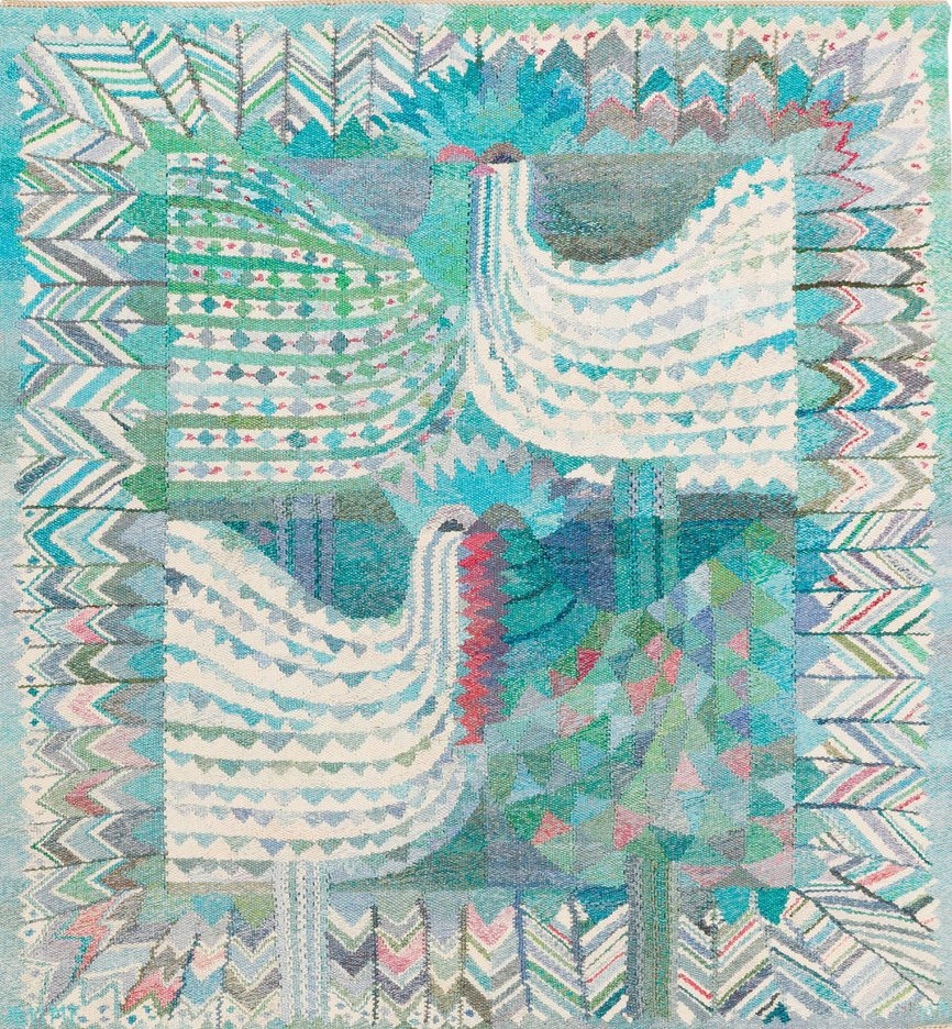 Se trata de un tapiz muy grande y raro, tejido a mano y de gran tamaño, diseñado por Marianne Richter (1916-2010) para los talleres AB Märta Måås-Fjetterströms de Båstad (Suecia). La composición se llama "Tuppamattan" ("Alfombra del gallo"). Se trata de una hermosa creación que representa cuatro gallos (o pavos reales) coloreados en tonos turquesa, verde esmeralda y aguamarina contrastados con detalles rosas.