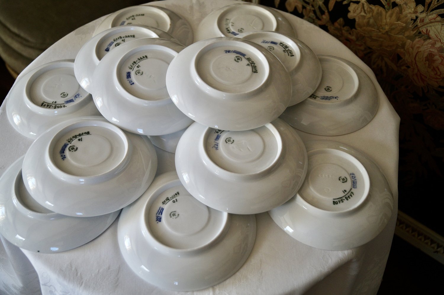 Servicio de postres antiguo con cesta, 1890. Juego de 14