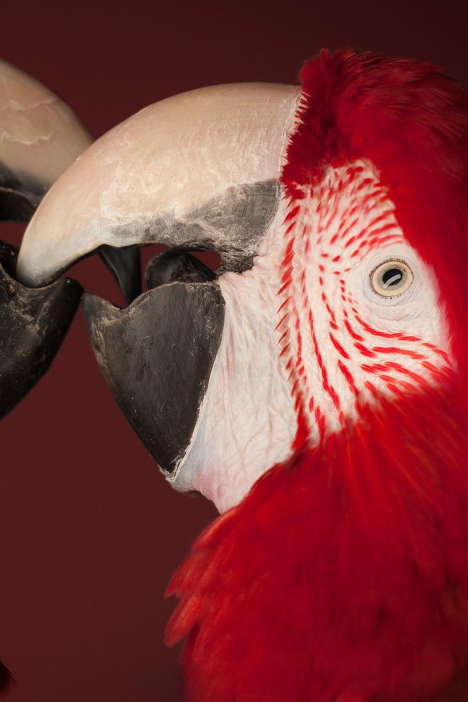 " Macaw #4 ” - Signed limited edition archival pigment print - Edition of 3 Green-Winged Macaws are monogamous and pair for life. They mate once in a lifetime, remaining and travelling together even out of the breeding season. Their beaks are powerful, allowing them to easily crack hard shelled nuts like the Brazil nut. The beak of the Green-Winged macaw can generate a pressure of 2000 pounds per square inch. Animal photography is about being ready for the split-second moment when it happens. This takes a certain amount of production. The studio set-up, the lighting and the camera settings can all be planned but the magic moment is seldom planned. It just happens naturally and you need to be prepared. Whether you capture it will depend on patience, concentration and reflex. This is an Archival Pigment print on fiber based paper ( Hahnemühle Photo Rag® Baryta 315 gsm , Acid- and lignin-free, Museum quality for highest age resistance and a popular alternative to analogue baryta paper). The inks used are also known for their longevity. Signed + numbered by artist with certificate of authenticity. Please note that prices increase as editions sell. Tim Platt specialises in creating minimal stylised studio portraits of birds and animals, which he describes as beauty shots. A frozen moment in time allows us to observe the world in suspension and will often reveal a graphic beauty that might otherwise flash by in the blink of an eye and remain unnoticed. Whether observing the magnified eye of a bullfrog, or an eagle captured at several thousandths of a second in mid-flight, he is fascinated by the level of detail that can be revealed in a large format print. It is the stillness of a photograph that gives us time to pause and marvel at the myriad levels of detail in Nature’s grand design and allows us to reflect on the wonderful diversity of life on Earth.