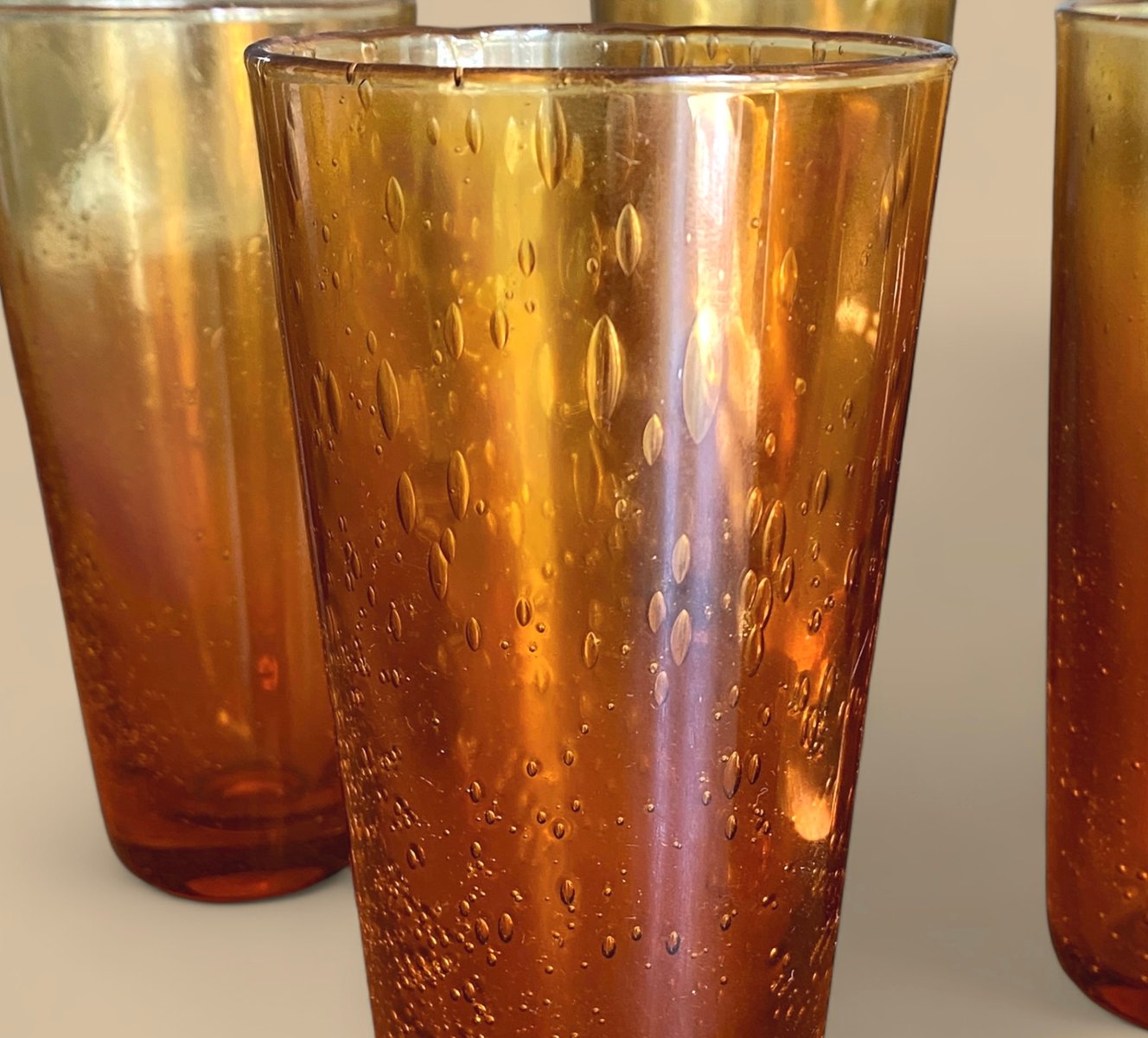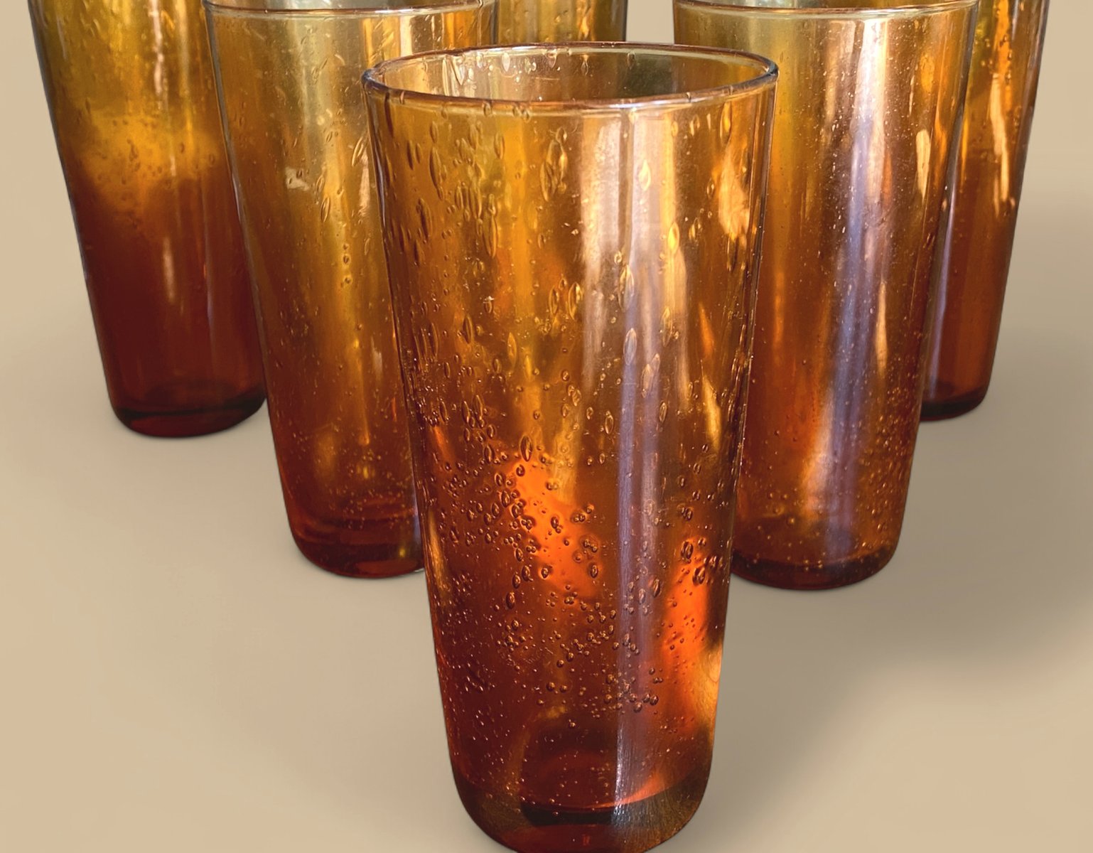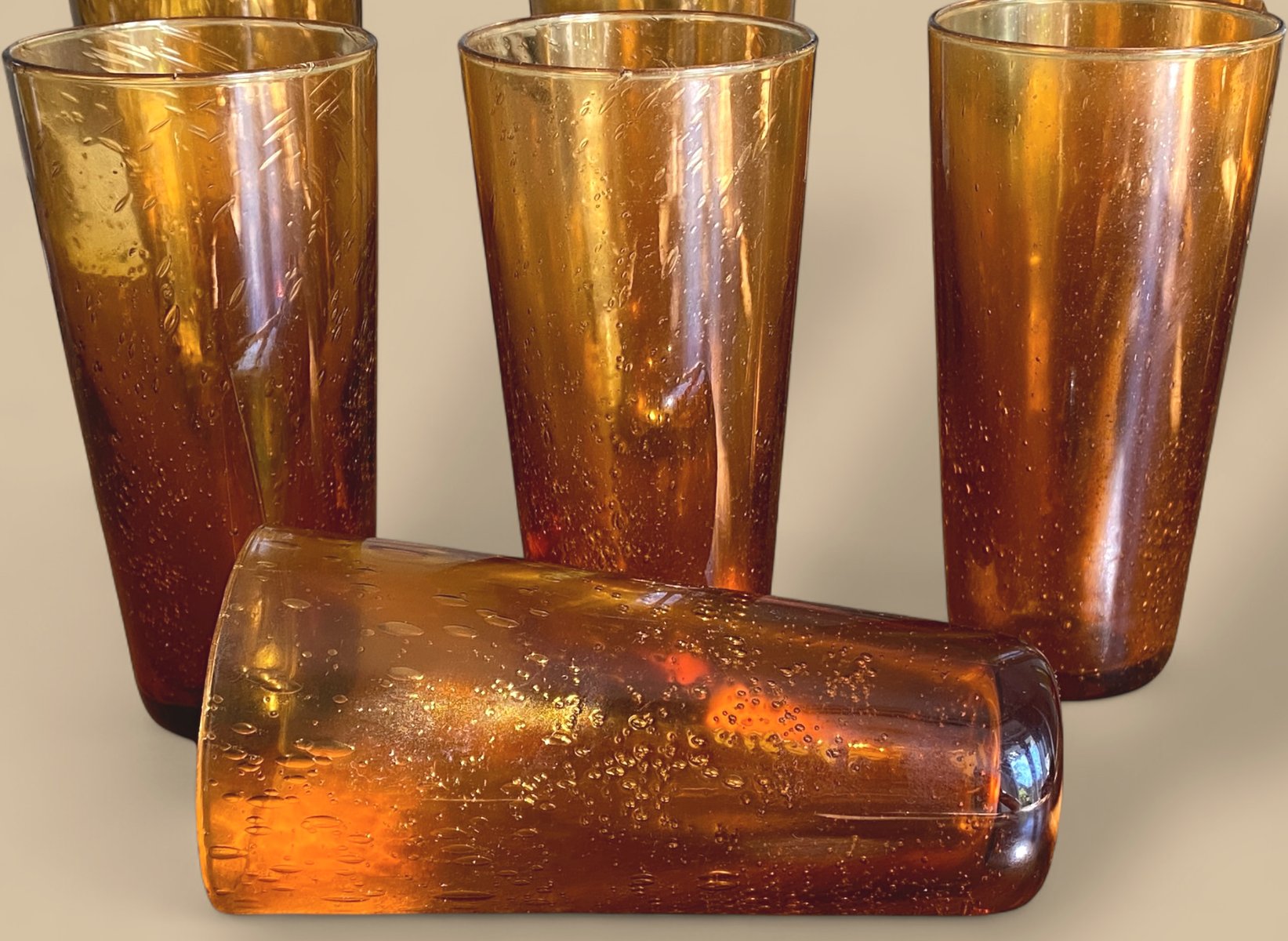 Vasos vintage grandes de vidrio burbuja de ámbar, Francia, años 70. Juego de 8