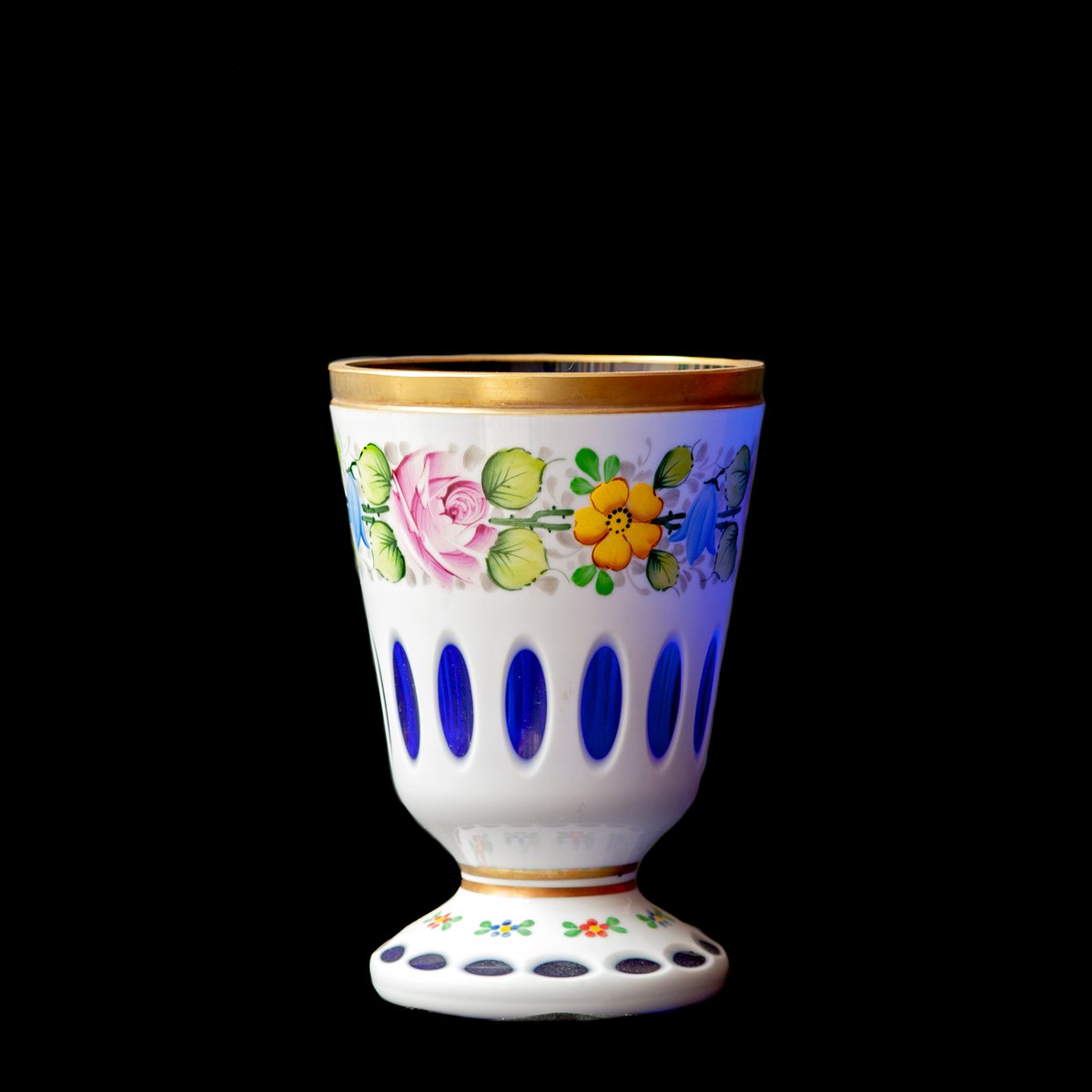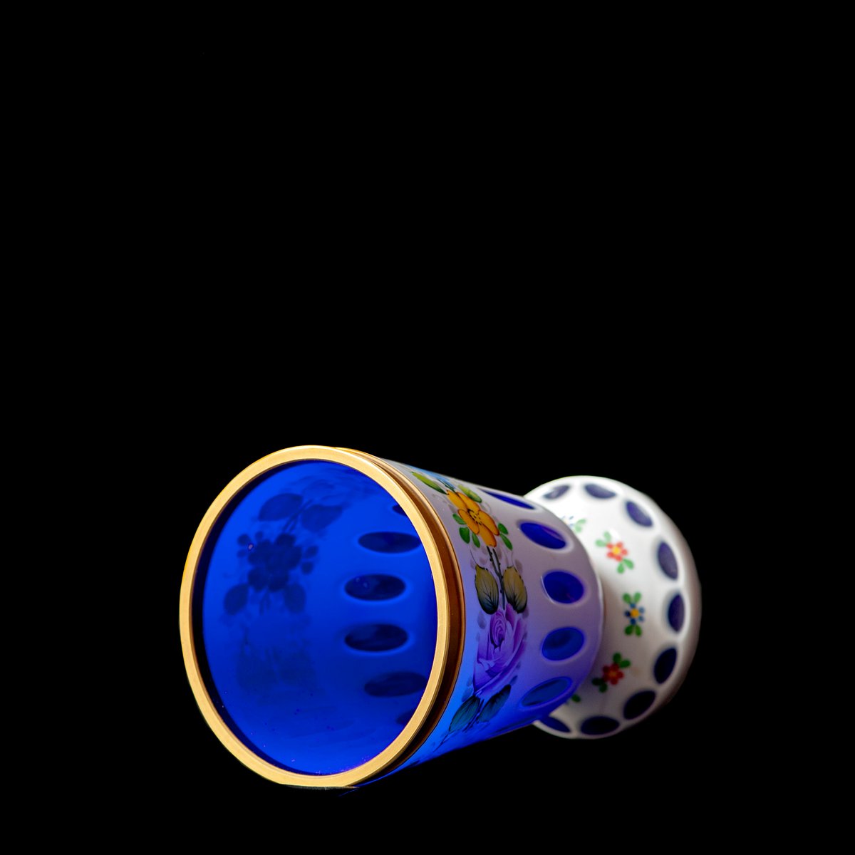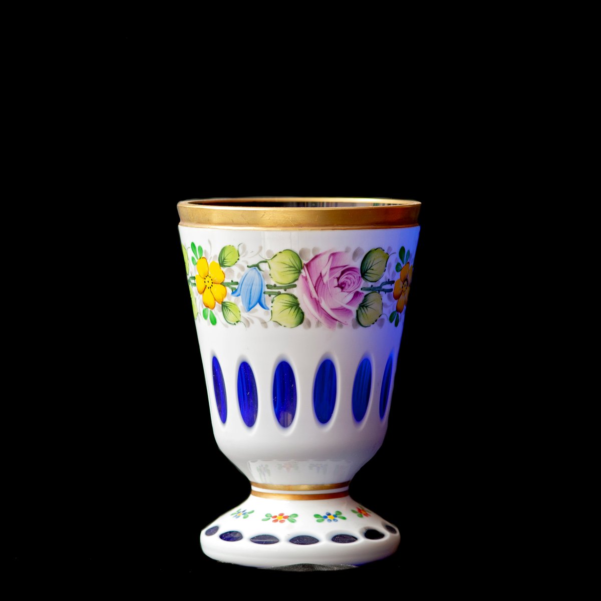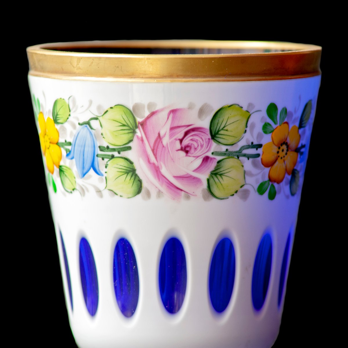 Vidrio Biedermeier blanco superpuesto en amarillo claro, vidrio con motivos florales y dorado esmaltado, lentes de corte profundo y jarrón azul dorado, década de 1890