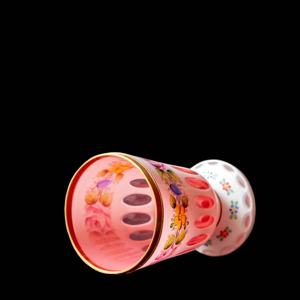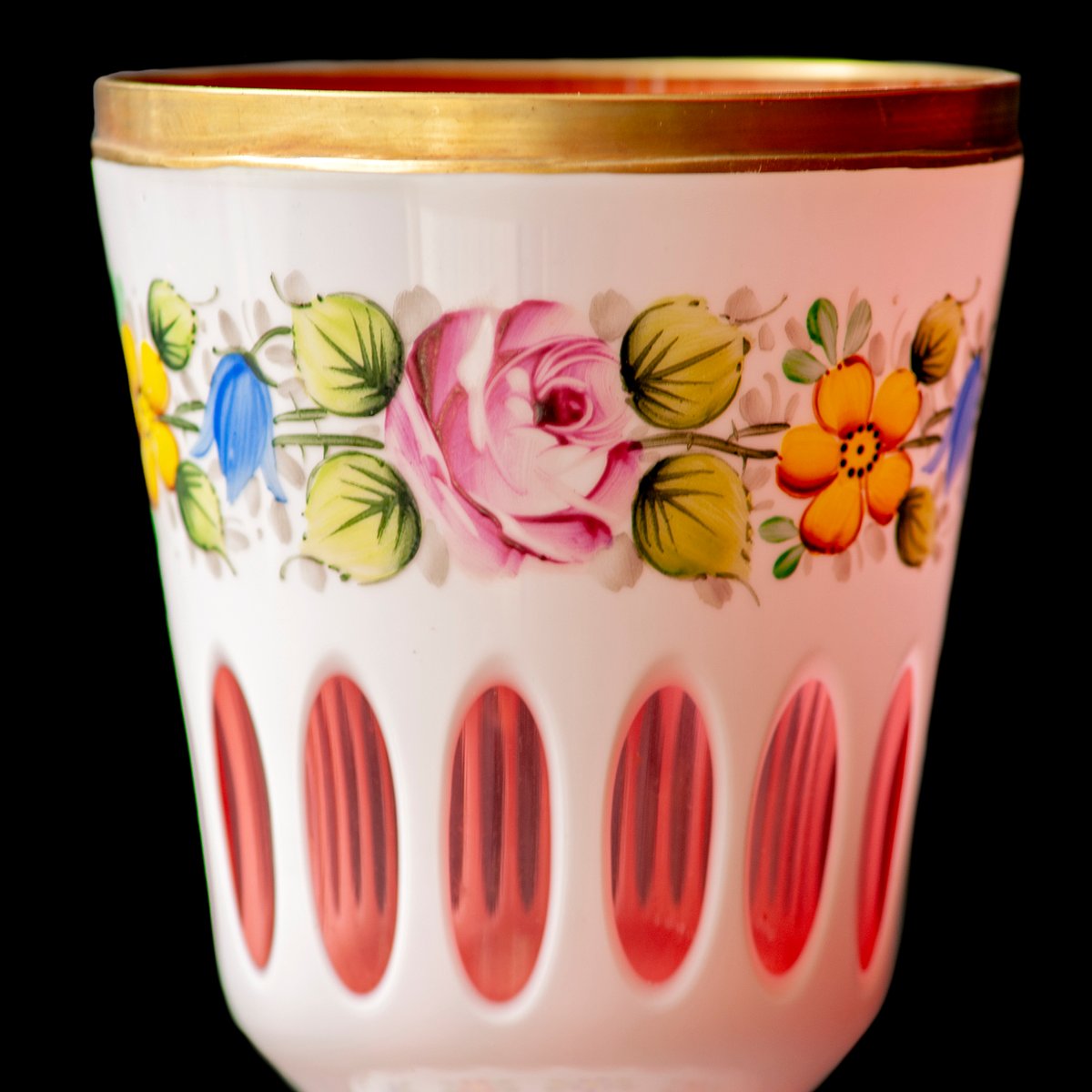 Vidrio Biedermeier blanco superpuesto en amarillo claro, vidrio con motivos florales y dorado esmaltado, lentes de corte profundo y jarrón rojo dorado, década de 1890
