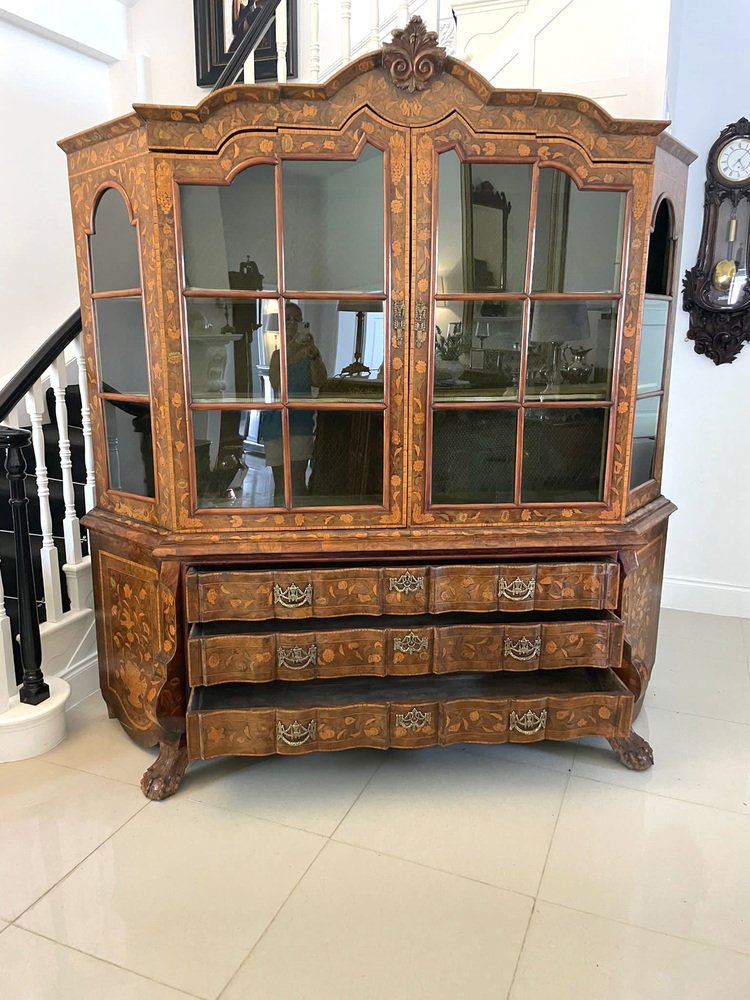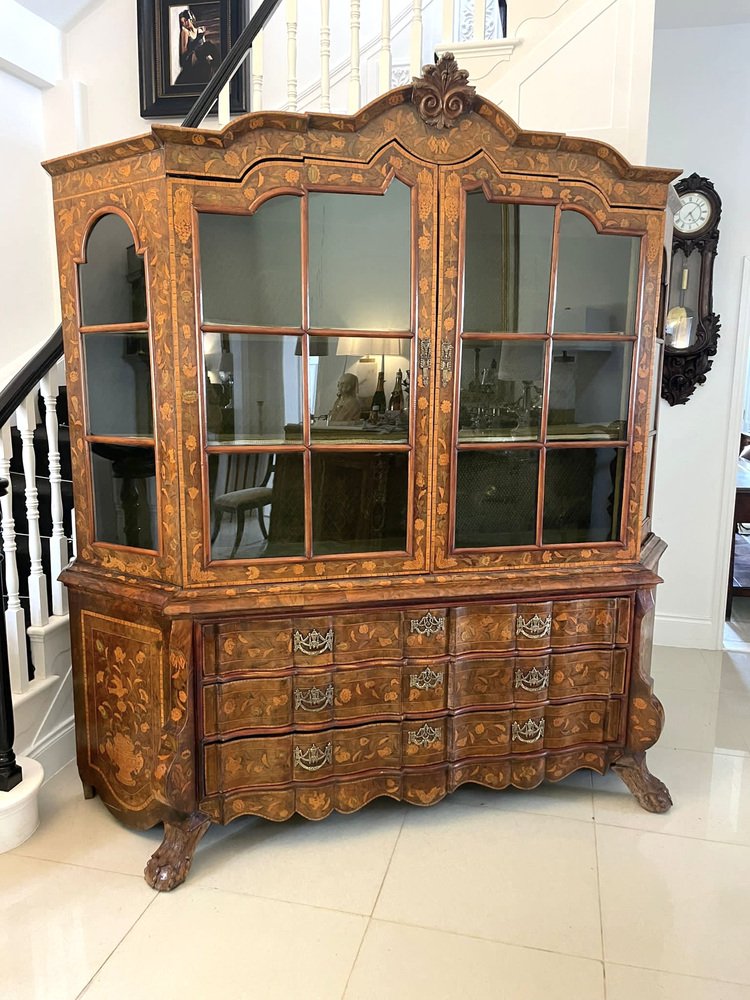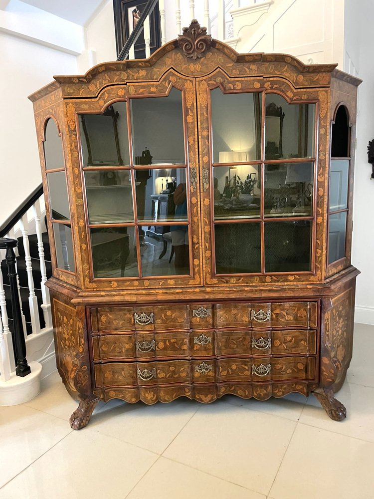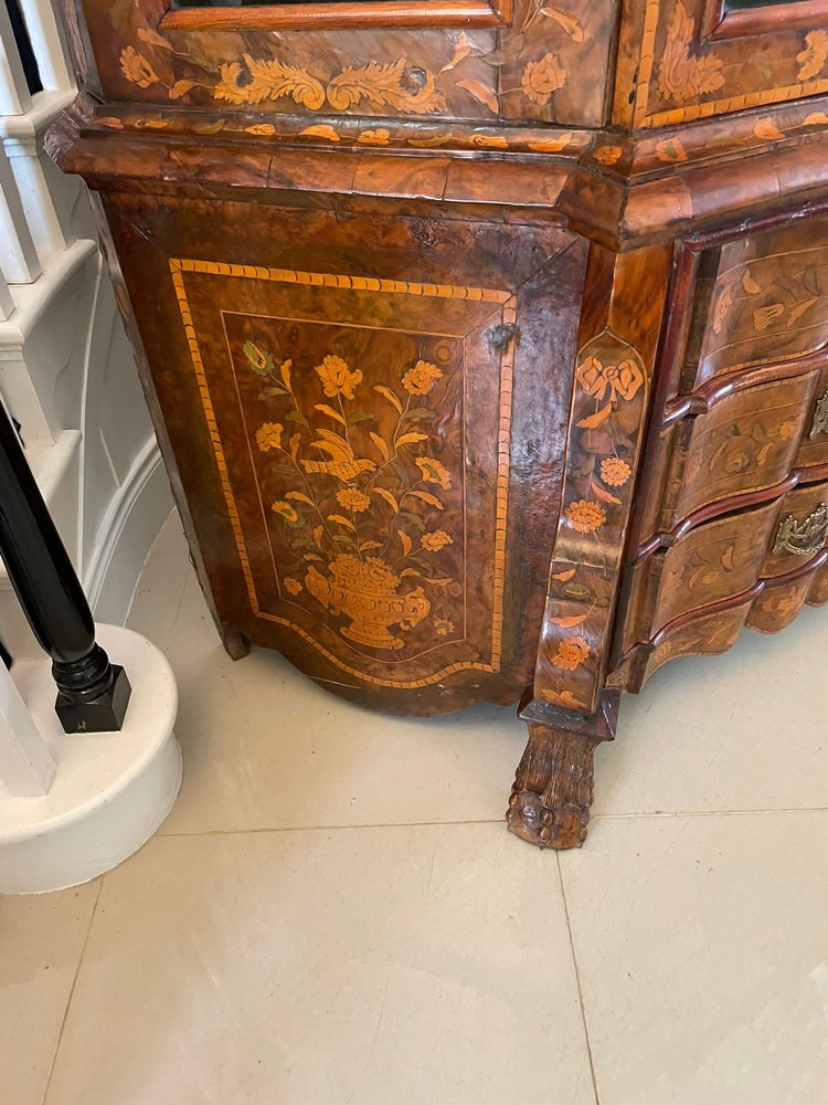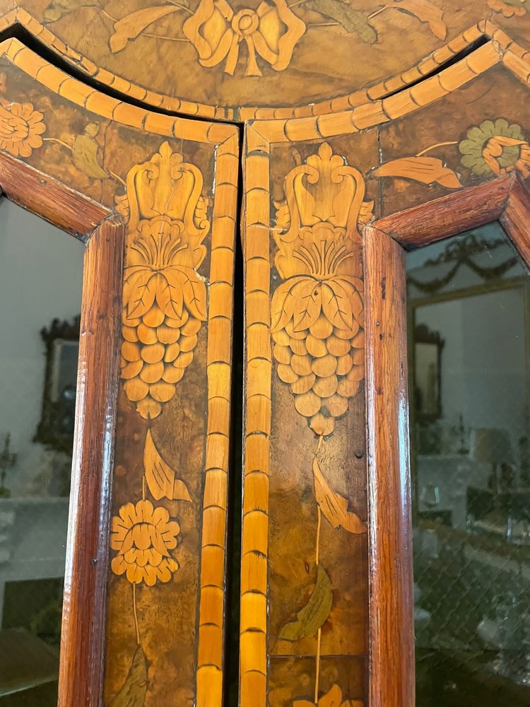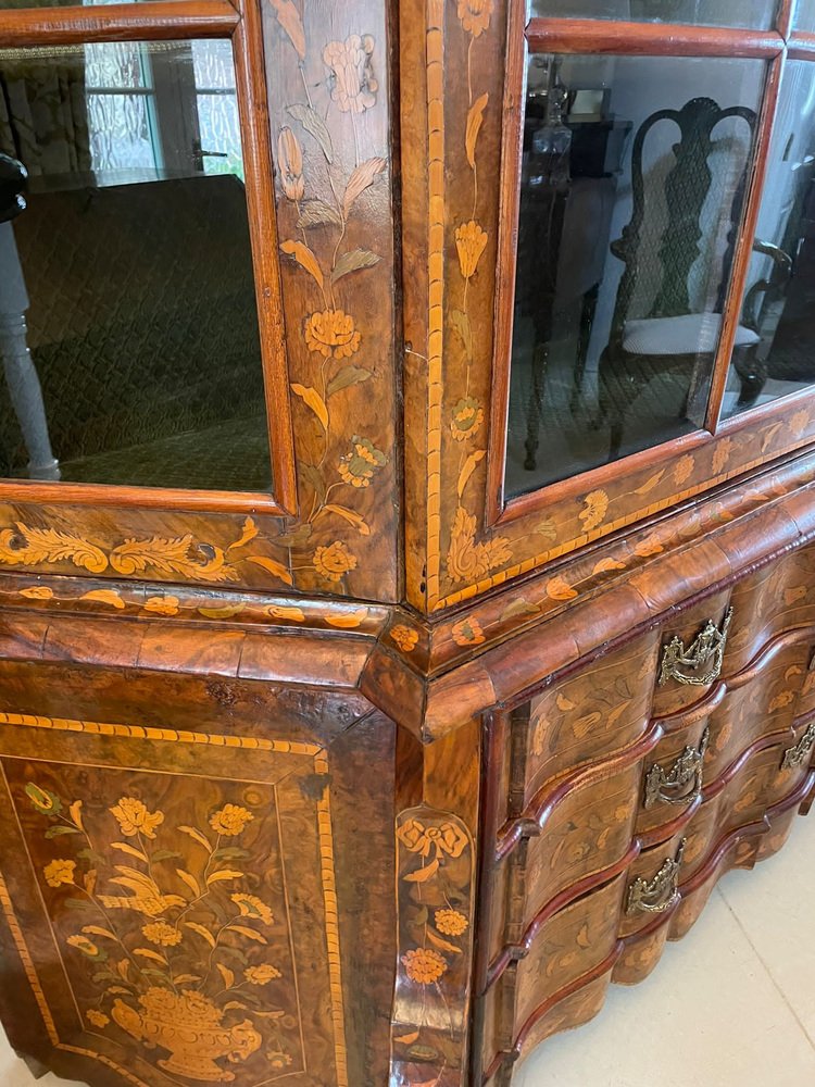 Vitrina holandesa antigua grande de marquetería floral con incrustaciones de nogal nudoso, 1800