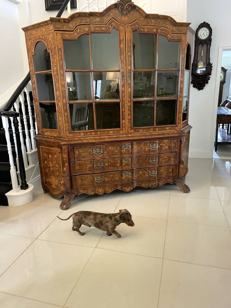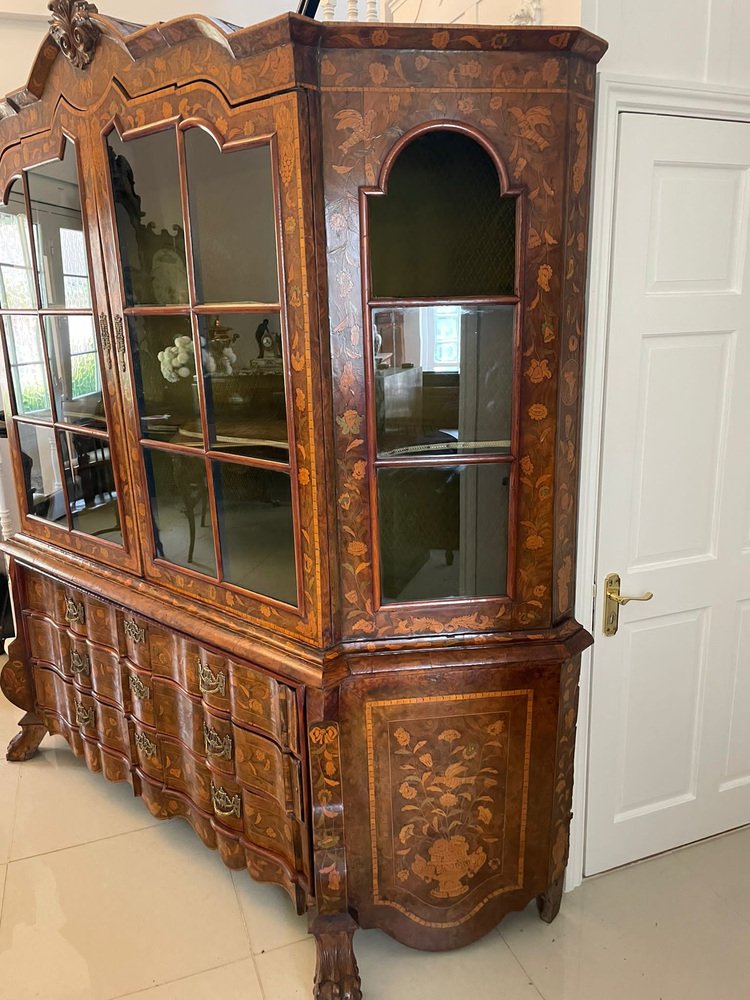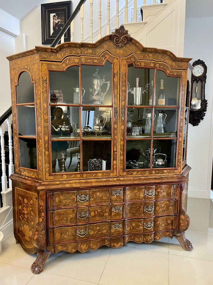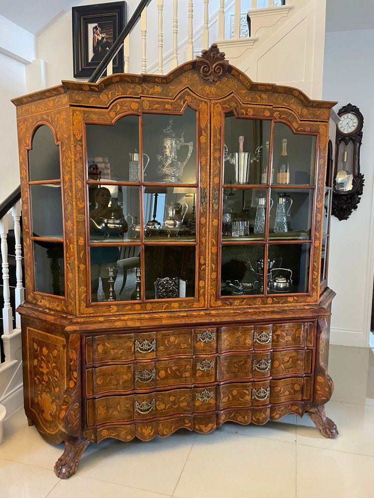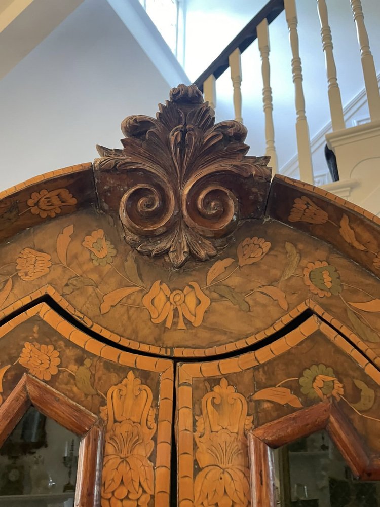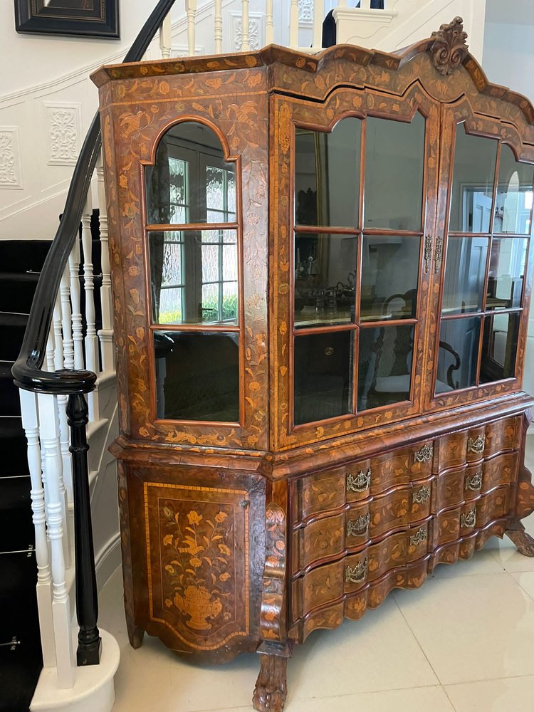 Vitrina holandesa antigua grande de marquetería floral con incrustaciones de nogal nudoso, 1800