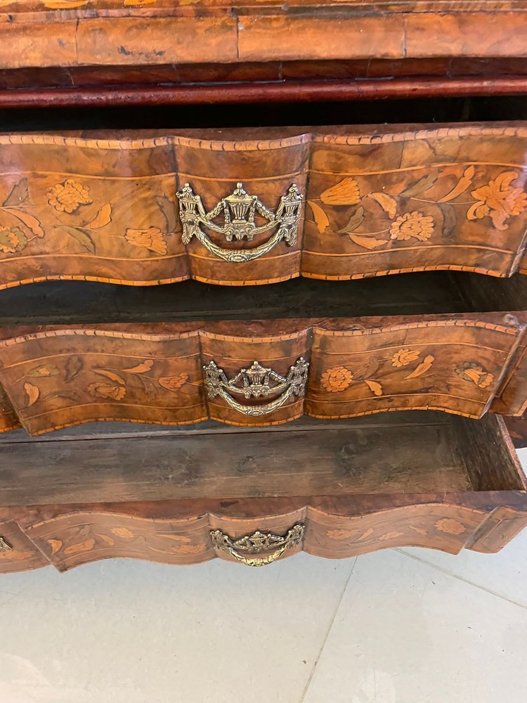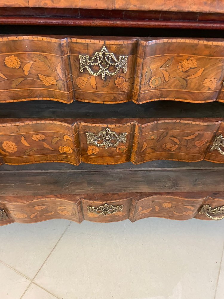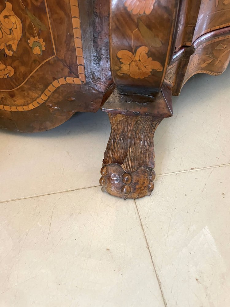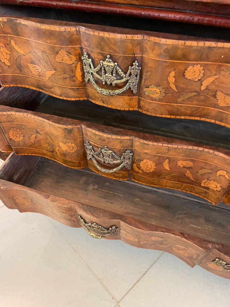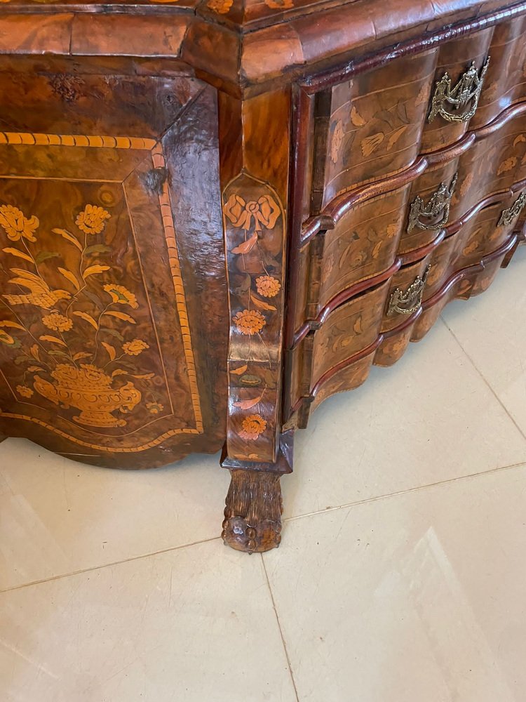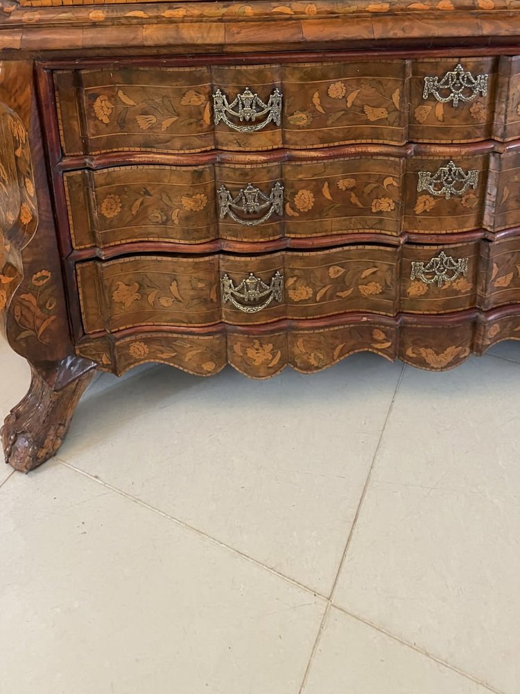 Vitrina holandesa antigua grande de marquetería floral con incrustaciones de nogal nudoso, 1800