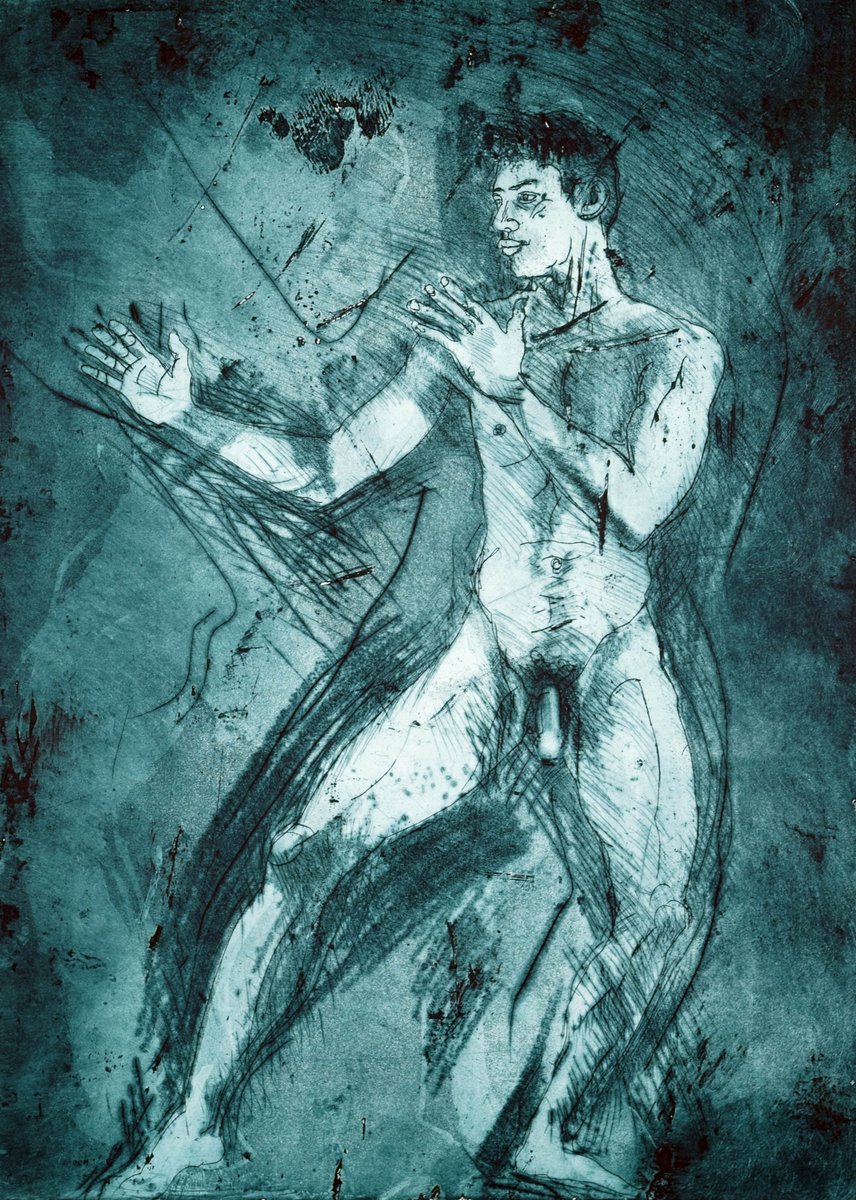Willibrord Haas calls his nudes, which stage the charms of the male body, "ignudi: "Ignudi is Italian and means 'naked, bare' in English, ignudo is known as the singular masculine, corresponding to Michelangelo's many magnificent naked youth figures that adorn the corners of the ceiling paintings in the Sistine Chapel -ignudi-. [This term implies the absence of shame, whereas the term -naked- is full of embarrassment".