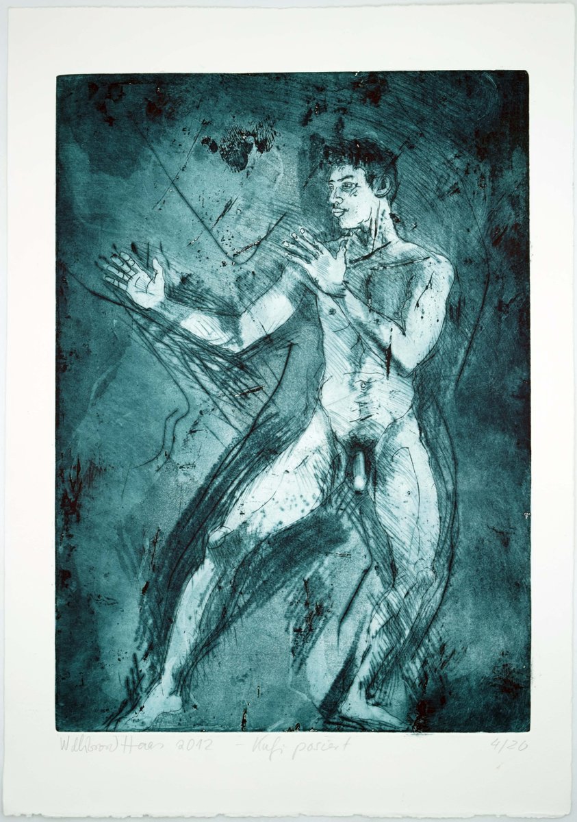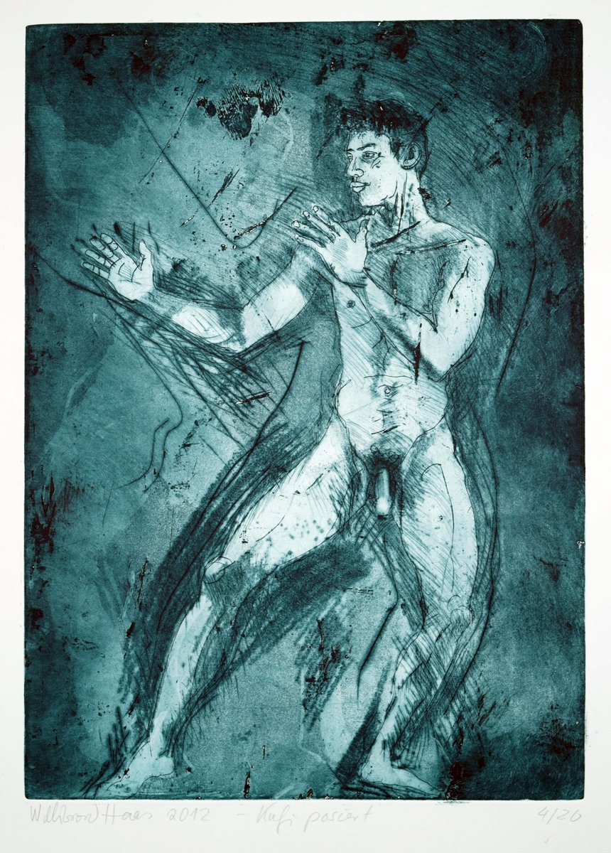 Willibrord Haas (*1936 Schramberg), Kufi poses, 2012. Etching, 44 cm x 32 cm (plate size), 54 cm x 37.5 cm (sheet size). Signed “Willibrord Haas” in lead by the artist, dated “2012”, titled “Kufi posiert” and numbered “4/20”.